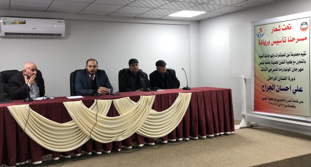 تستمر كلية الفنون الجميلة لليوم الثالث في استضافة فعاليات مهرجان المونودراما المسرحي الثالث دورة الفنان الراحل علي احسان الجراح تحت شعار (مسرحنا .. تأسيس وريادة) وبالتعاون مع مجموعة نون لإقامة المؤتمرات والمهرجانات والذي يقام للمدة من 12-17 كانون الثاني 2021 ،