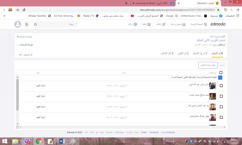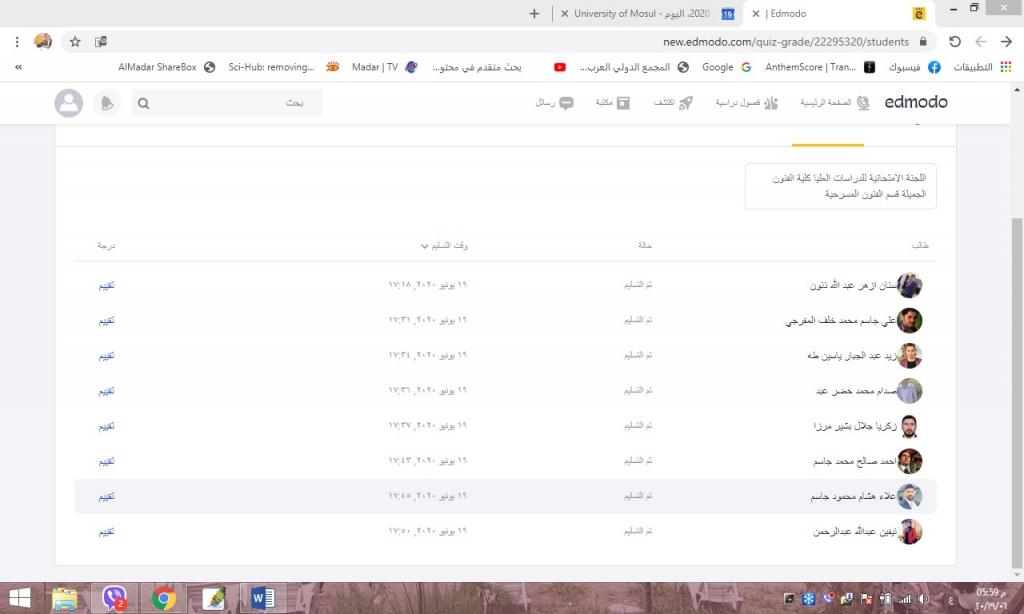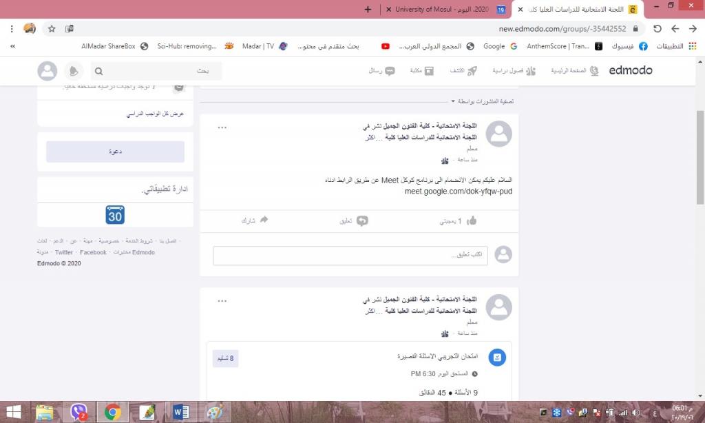 تنفيذا لتوجيهات رئاسة الجامعة وبإشراف الدكتور نشأت مبارك صليوا عميد الكلية واللجنة الامتحانية تم اجراء اختبار تجريبي لطلبة الدراسات العليا في كلية الفنون الجميلة على منصة Edmodo يوم الجمعة الموافق ١٩ حزيران ٢٠٢٠ وقسمت الاسئلة حسب التعليمات الوزارية للدراسات العليا وارفاق رابط google Meet لغرض متابعة الطلبة اثناء الاختباروقام بإجراء الاختبار للطلبة الدكتور سيف الدين امجد اسماعيل احد اعضاء اللجنة الامتحانية في الكلية .