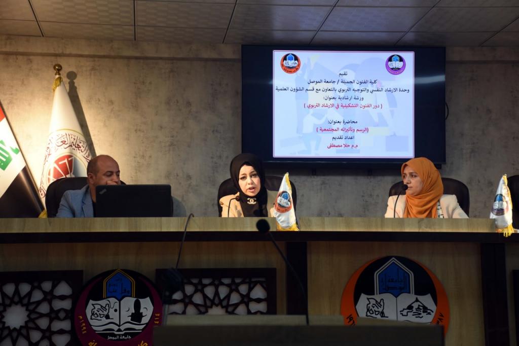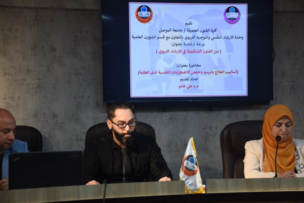 برعاية رئيس جامعة الموصل الاستاذ الدكتور قصي کمال الدين الاحمدي وبإشراف وحضور عميد كلية الفنون الجميلة الأستاذ الدكتور نشأت مبارك صليوا اقامت كلية الفنون الجميلة / وحدة الارشاد النفسي والتوجيه التربوي بالتعاون مع قسم الشؤون العلمية في جامعة الموصل ورشة ارشادية بعنوان (دور الفنون التشكيلية في الارشاد التربوي ) على قاعة المناقشات يوم الثلاثاء الموافق ٥ نيسان ٢٠٢٢ بحضور عدد من الاساتذة والكادر الوظيفي والطلبة.افتتحت الورشة بكلمة ترحيبية للحضور والاشادة بأهمية الموضوع .