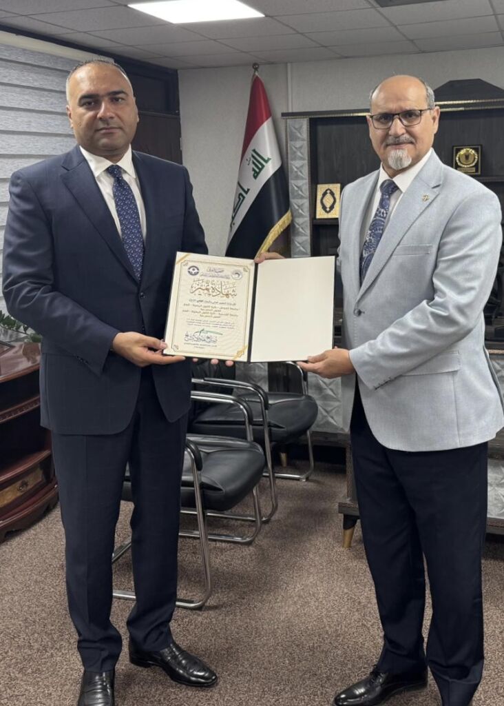 و قد تسلم الشهادة الاستاذ الدكتور حامد ابراهيم الراشدي عميد كلية الفنون الجميلة ، وبهذا التميز نتقدم باسمى التهاني والتبريكات لرئاسة الجامعة وعمادة الكلية وكل من ساهم في هذا التميز.