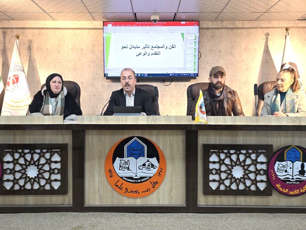 اقامت وحدة شؤون المرأة بالتعاون مع وحدة التعليم المستمر في كلية الفنون الجميلة المحاضرة الموسومة ( دور المرأة في الفنون المعاصرة ومساندة الرجل لها ) الاثنين ٢٩ كانون الاول ٢٠٢٥ ، بحضور المعاون العلمي وعدد من منتسبي الكلية ، القاها كل من أ.د. ميادة مجيد الباجلان مسؤولة وحدة شؤون المرأة وم.م. يونس محمد يونس / مديرية تربية نينوى ، والتي تهدف الى ابراز دور المرأة كفاعل اساسي في صياغة الخطاب الفني وتوجيهه ودورها المحوري في مختلف مجالات الفنون المعاصرة ، وقدرتها على الابداع والابتكار والمساهمة في طرح القضايا الانسانية والمجتمعية ، وبما يحقق الهدف (5) للتنمية المستدامة : المساواة بين الجنسين .