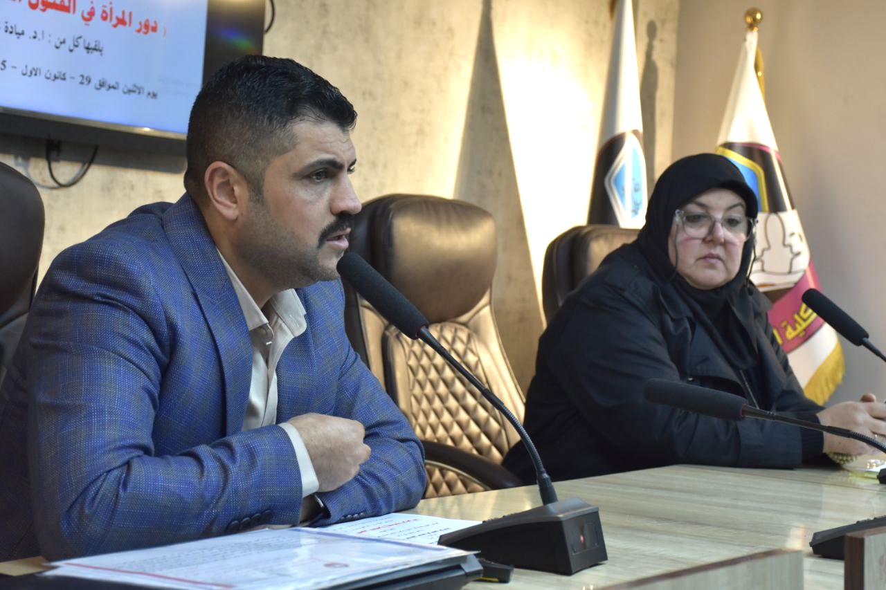 محاضرة في كلية الفنون الجميلة حول دور المرأة في الفنون المعاصرة ومساندة الرجل لها