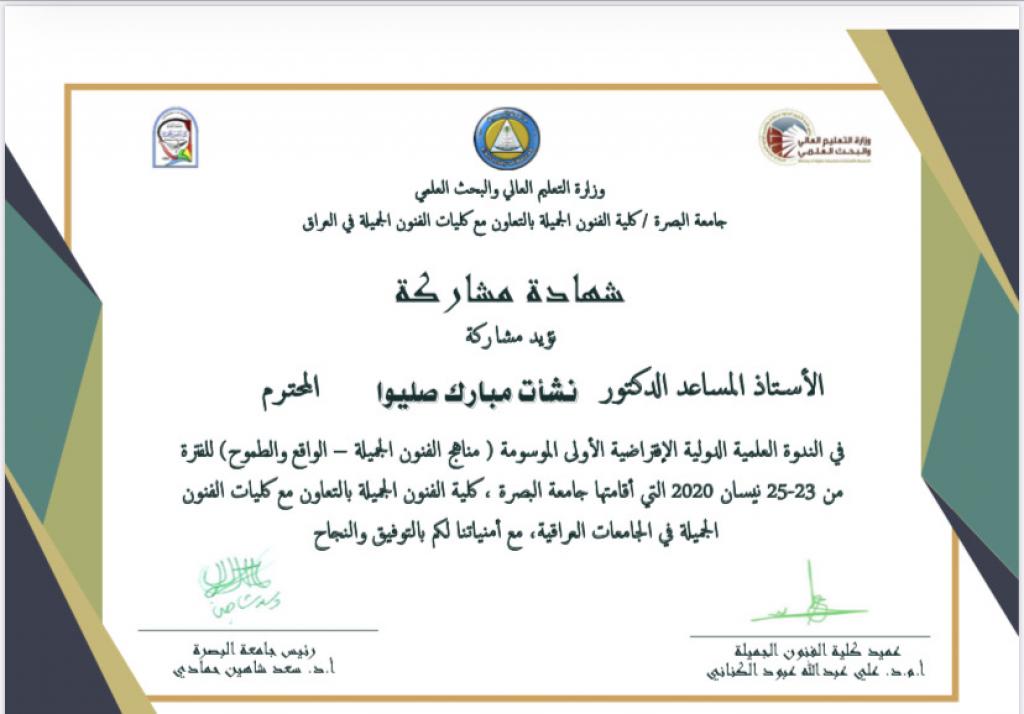 شارك الدكتور نشأت مبارك صليوا عميد كلية الفنون الجميلة في الندوة الدولية الافتراضية الاولى والموسومة ( مناهج الفنون الجميلة – الواقع والطموح ) الى جانب الدكتور نذير عبد الغني محمد والمدرس هاني عبد الله محمود، حيث تم تقديم أوراق بحثية حول محور دور الوسائل التقنية الحديثة في تطوير الفنون الجميلة ومحور سياسات تطوير مناهج الفنون الجميلة.