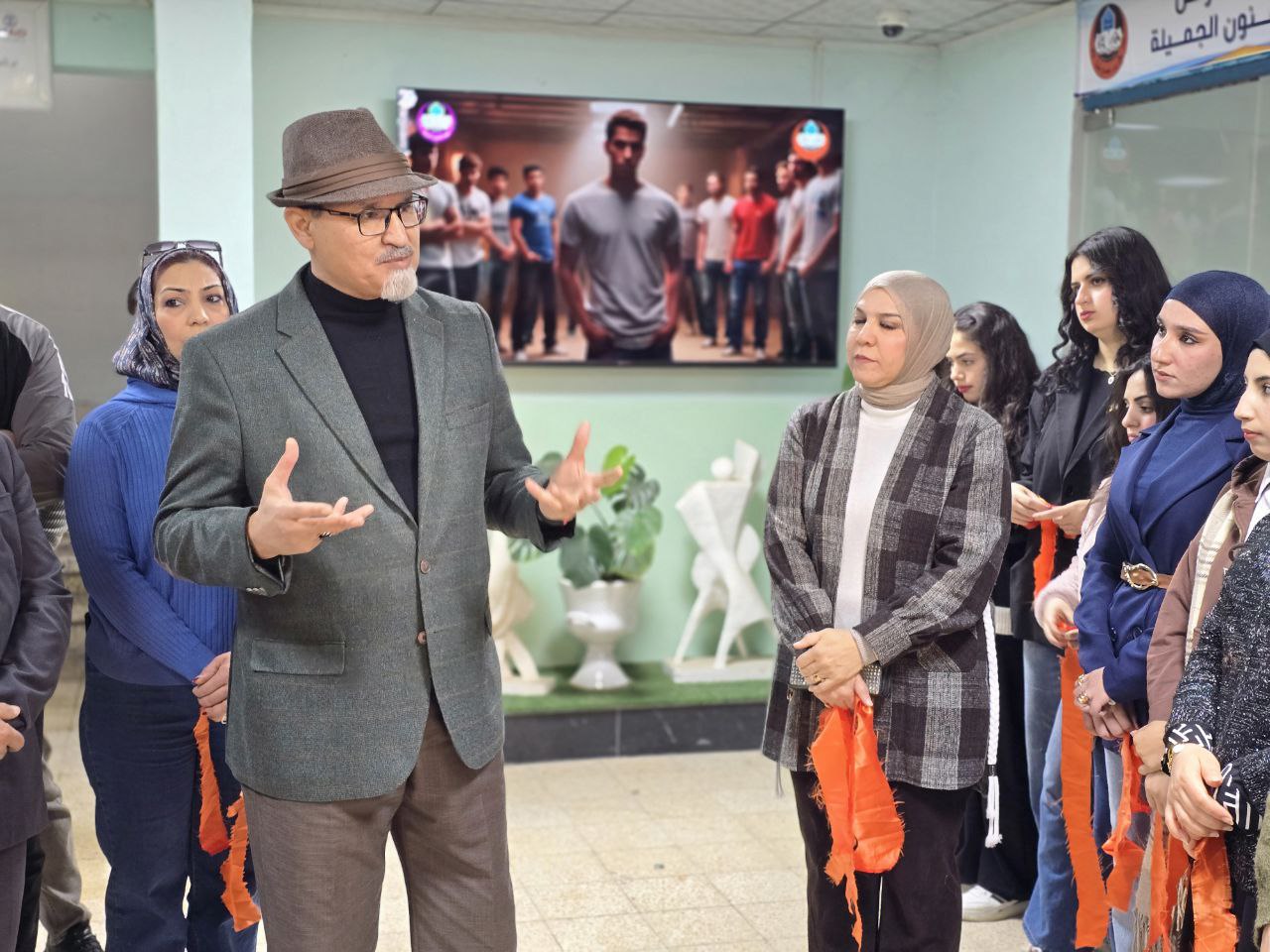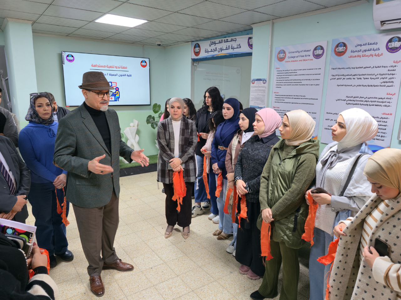 بحضور الاستاذ الدكتور حامد ابراهيم الراشدي عميد كلية الفنون الجميلة اقامت وحدة العمل التطوعي بالتعاون مع رئاسة جامعة الموصل – وحدة شؤون المراة ، عمل تشجيعي تطوعي بعنوان (معاً ضد العنف … لكرامة المرأة) استكمالاً لسلسة فعاليات (١٦) يوم للقضاء على العنف ضد المرأة الخميس ٢٧ تشرين الثاني ٢٠٢٥ في مدخل الكلية والتي القى فيها السيد عميد الكلية كلمة تشجيعية عن الحد من الظواهر السلبية في التعامل مع المرأة والحرص على كراهيتها وخصوصيتها ، بحضور الطلبة ومسؤلة وحدة العمل التطوعي ، فضلاً عن ارتداء وشاح بلون برتقالي للطالبات و بما يتماشى مع اهداف التنمية المستدامة الهدف (٥) ، (١٦)