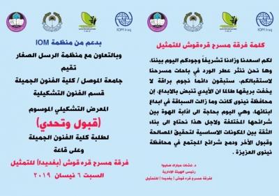 اقام قسم الفنون التشكلية – كلية الفنون الجميلة معرض فني لطلبة القسم بعنوان (قبول وتحدي) في قاعة مسرح قره قوش – الحمدانية , بتنسيق التدريسي رائد فرحان والتدريسية فردوس بهنام من قسم الفنون التشكيليةيوم السبت الموافق 6 نيسان 2019 الساعة الرابعة عصرابالتعاون مع منظمة iomومنظمة رسل الصغار واستضافة فرقة مسرح قره قوش للتمثيل .. وتم خلال العرض تكريم الطلبة المشاركين والسادة المشرفين ومسؤول القاعة بالإضافة الى المنسق من منظمة رسل الصغار وكان هذا النشاط جزء من روح التعاون مابين مؤسسات الدولة والمجتمع المدني وفي ضوء ماتوجهت به وزارة التعليم العالي والبحث العلمي