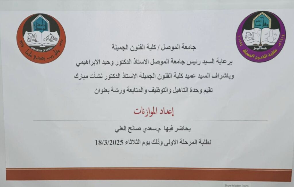 بإشراف الاستاذ الدكتور نشأت مبارك صليوا عميد كليتنا الجميلة وحضور المطران ميخائيل نجيب رئيس اساقفة الموصل وعقرة اقامت وحدة التعليم المستمر وشعبة الدراسات والتخطيط وبالتعاون مع الأبرشية الكلدانية في الموصل وعقرة اليوم الثلاثاء ١٨ اذار ٢٠٢٥ ندوة علمية ومعرضا تشكيليا حملا عنوان (الفنان ماهر حربي حضور دائم في الذاكرة الموصلية).