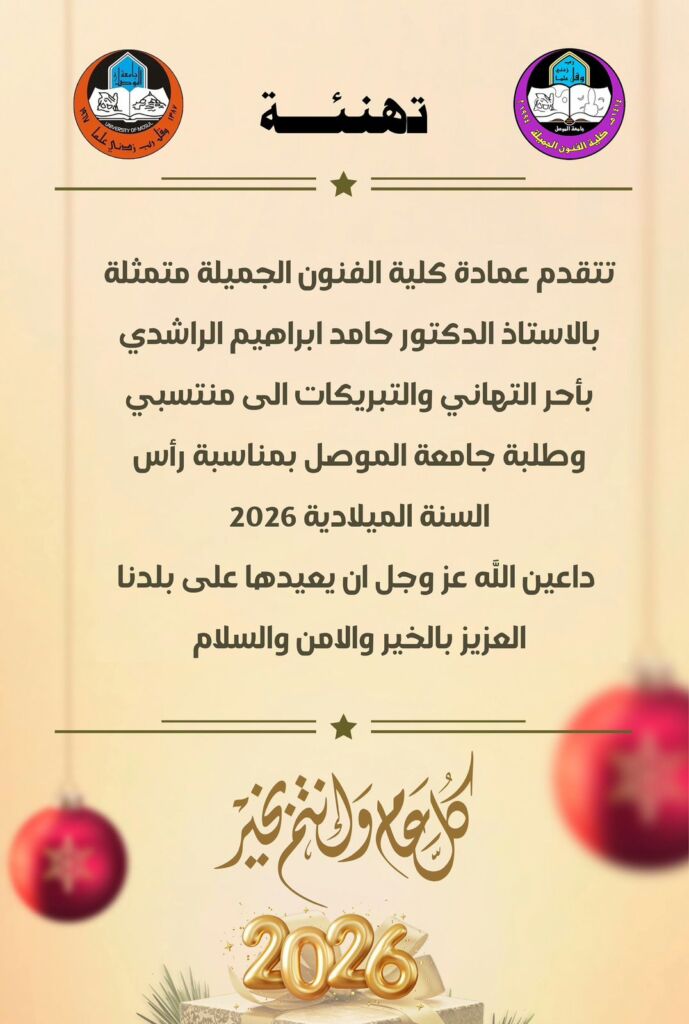 برعاية الاستاذ الدكتور وحيد محمود الابراهيمي رئيس جامعة الموصل وبإشراف الاستاذ الدكتور حامد ابراهيم الراشدي عميد كلية الفنون الجميلة إقامت وحدة التعليم المستمر بالتعاون قسم الدراسات والتخطيط/ وحدة التنمية المستدامة في رئاسة جامعة الموصل ، الندوة العلمية الموسومة (التحول الى نظام بولونيا .. افاق وتحديات التعليم العالي) اليوم الاحد ٤ كانون الثاني ٢٠٢٦ على قاعة جلال جميل ، وبحضور السادة مقرري الأقسام وكافة اعضاء اللجان العلمية واللجان الامتحانية واللجان الفرعية ، والتي حاضر فيها كل من أ.د.حامد ابراهيم الراشدي ، م.د. عمر فواز الجلبي ، أ.م. فردوس بهنام يشوع ، م. أزهار حكمت محمود وادارها أ.م.د. زيد طارق فاضل .