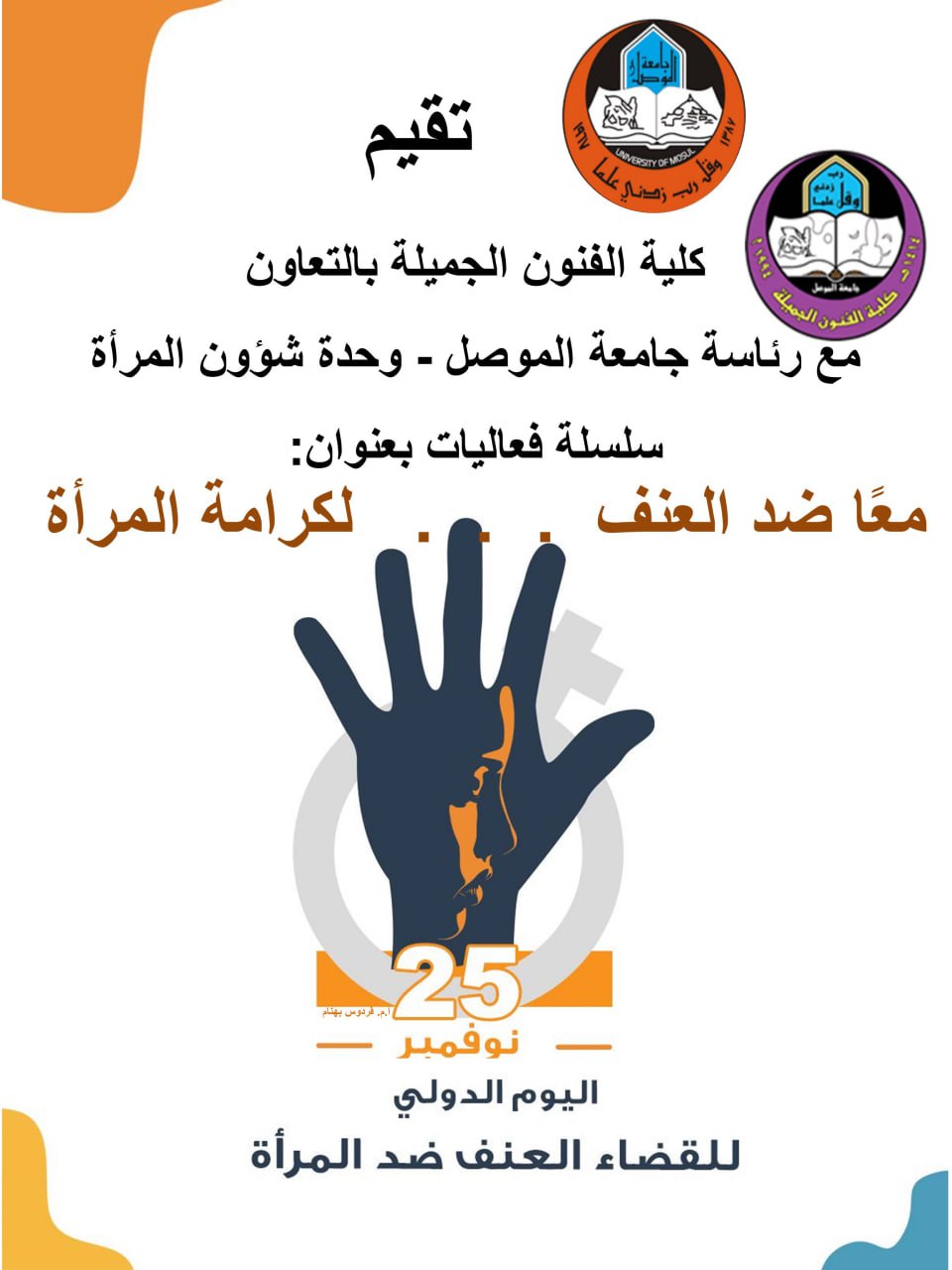 اقامت كلية الفنون الجميلة بالتعاون مع وحدة شؤون المرأة في رئاسة جامعة الموصل وضمن سلسلة معاً ضد العنف ..لكرامة المرأة الورشة الموسومة (تطوير مهارات الوالدين في ادارة شؤون الاسرة) بحضور المعاون العلمي وعدد من منتسبي وطلبة الكلية ، والتي القاها كل من ا.م مائدة طارق و م. ازهار رمزي و م.حلا مصطفى .
