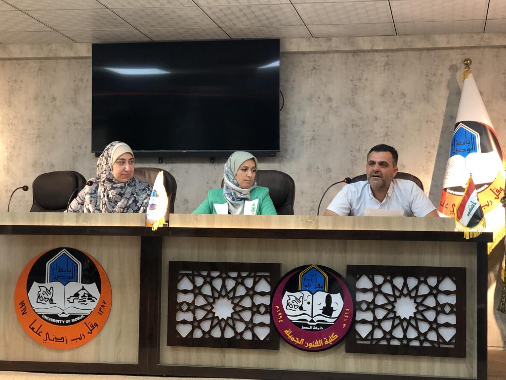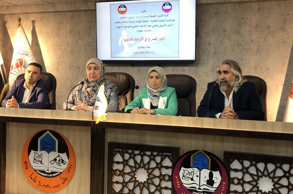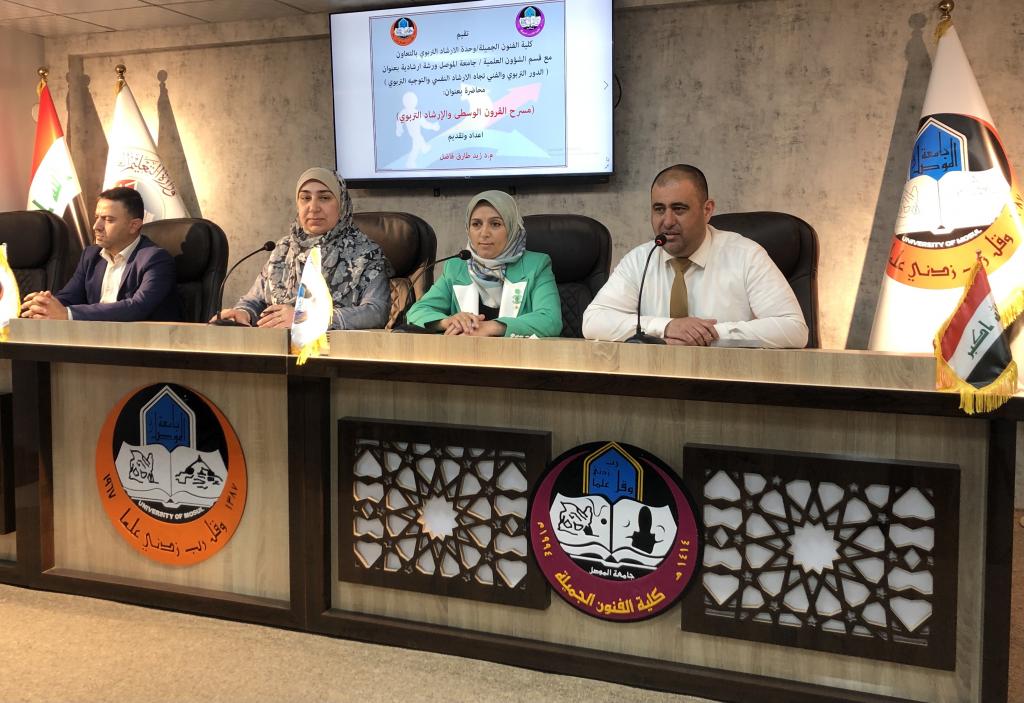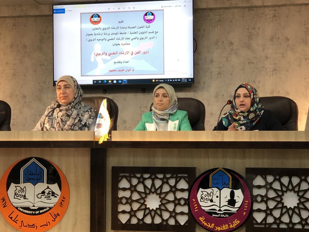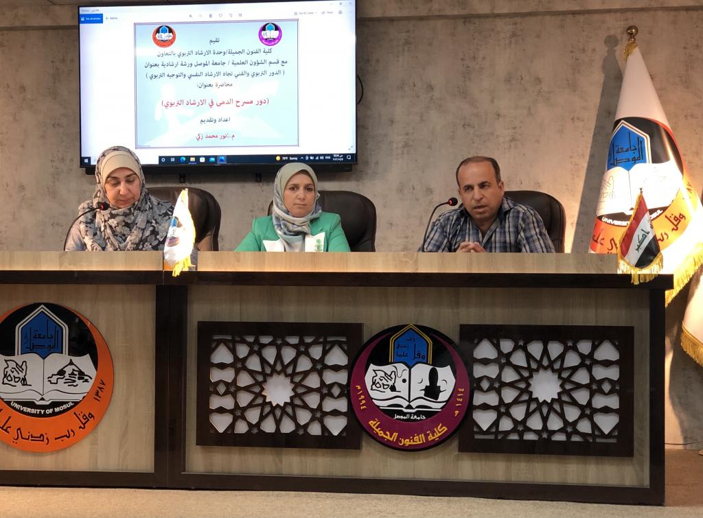 بحضور الأستاذ الدكتور نشأت مبارك صليوا عميد كلية الفنون الجميلة والاستاذ المساعد الدكتور بشار عبد الغني محمد معاون العميد للشؤون العلمية اقامت وحدة الارشاد التربوي في كلية الفنون الجميلة ورشتها الثانية الموسومة الدور التربوي والفني تجاه الارشاد وبمشاركة طيبة من اساتذة قسمي الفنون المسرحية والتربية الفنية وتمحورت الأوراق البحثية عن دور الفن والمسرح التربوي في الارشاد المجتمعي . يذكر أن هذه الورشة التي اقيمت اليوم الاثنين 11 نيسان 2022 خرجت بتوصيات إلى الجهات ذات العلاقة من شأنها الارتقاء بواقع الدور الارشادي للفنون.