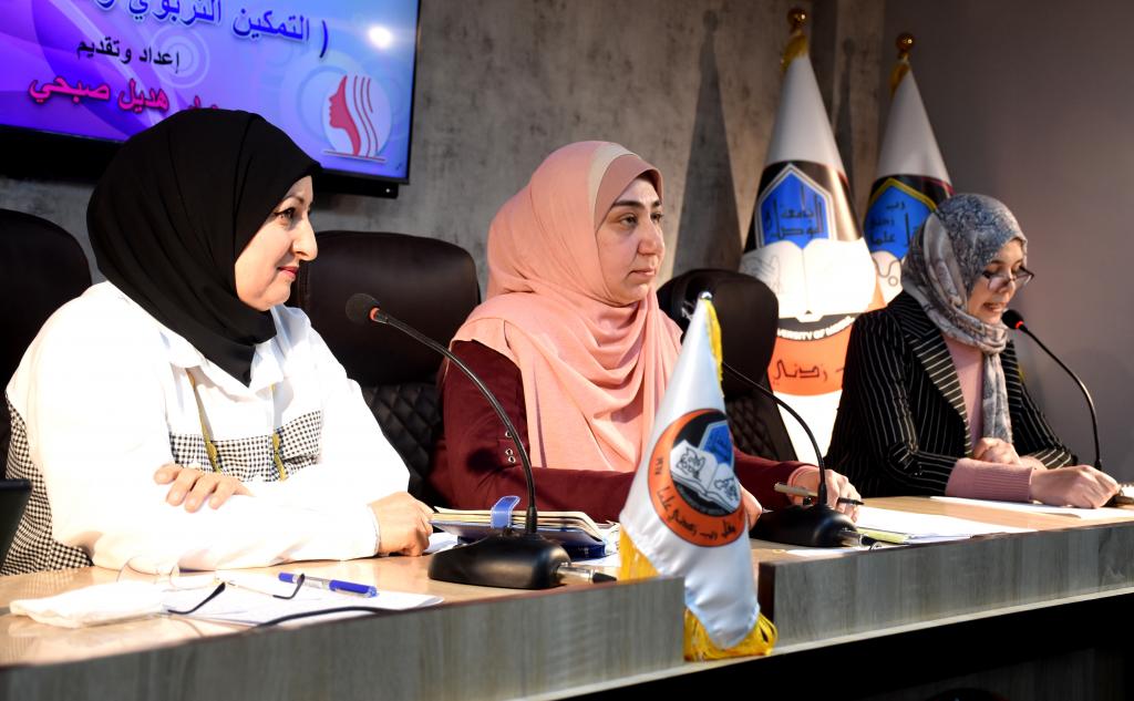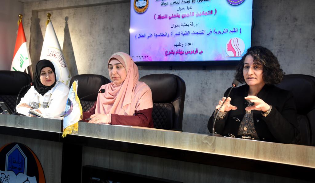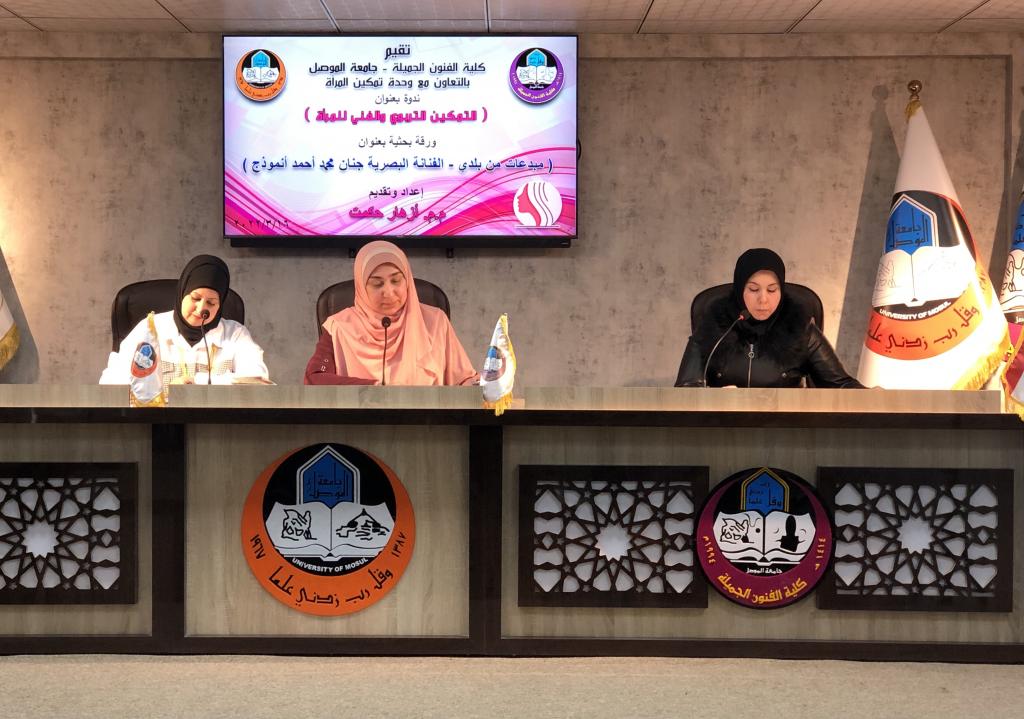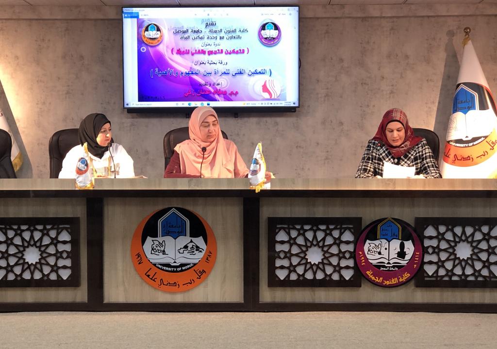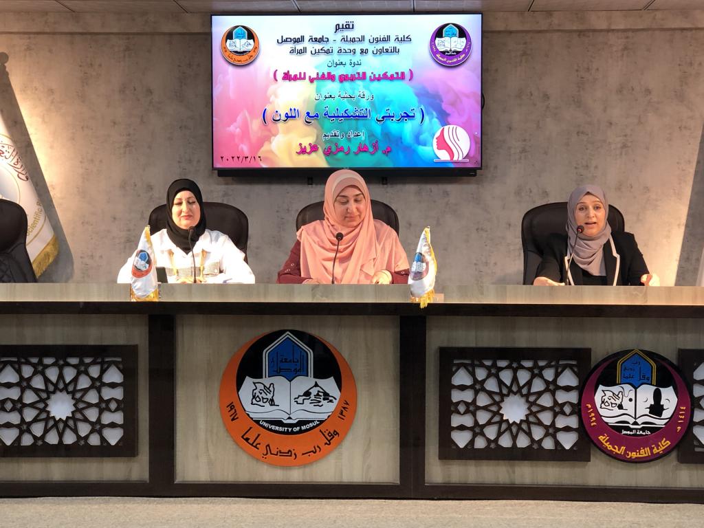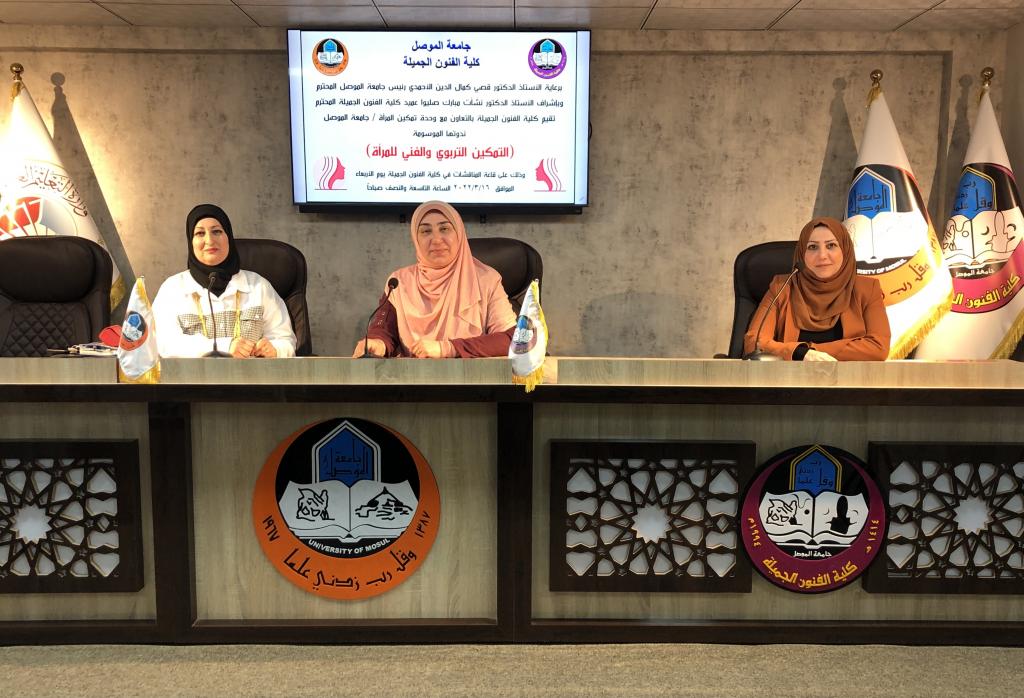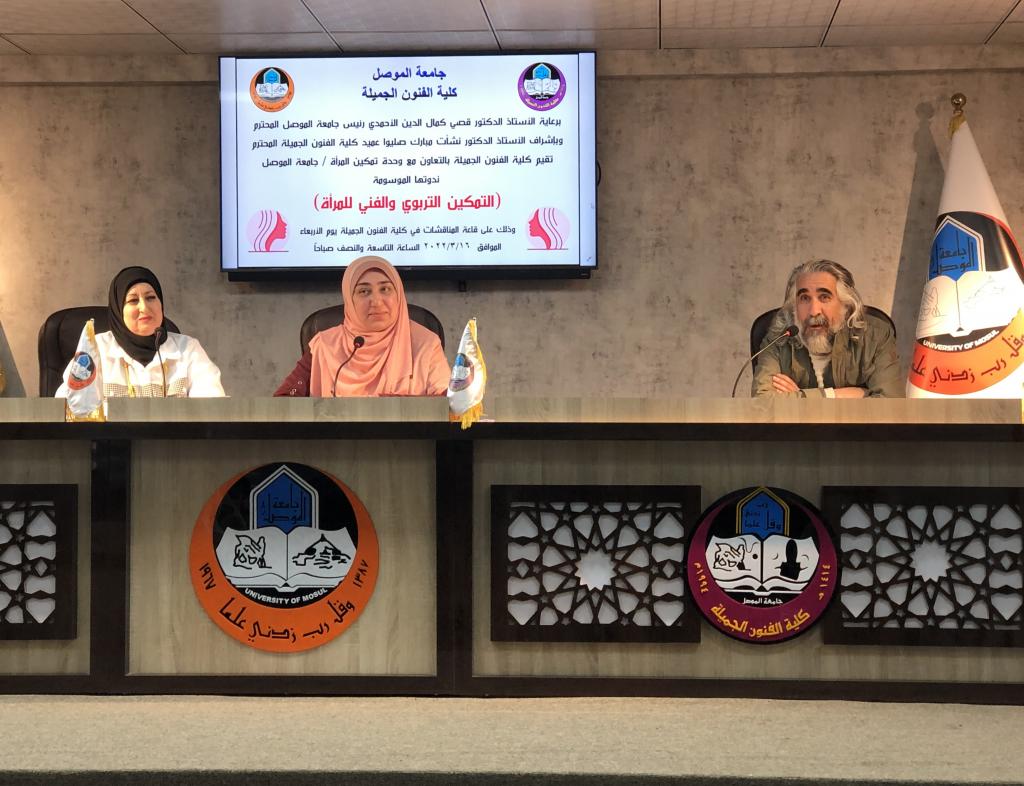 برعاية السيد رئيس جامعة الموصل الاستاذ الدكتور قصي کمال الدين الاحمدي المحترم وبإشراف وحضور عميد كلية الفنون الجميلة الأستاذ الدكتور نشأت مبارك صليوا المحترم، والدكتورة ريم محمد الحفوظي مسؤولة وحدة تمكين المرأة في رئاسة جامعة الموصل ، اقامت كلية الفنون الجميلة ندوتها الموسومة (التمكين التربوي والفني للمرأة) على قاعة المناقشات يوم الاربعاء الموافق ١٦ اذار ٢٠٢٢ بحضور عدد كبير من منتسبي كليتنا جلهم من انساتنا وسيداتنا الفضليات.