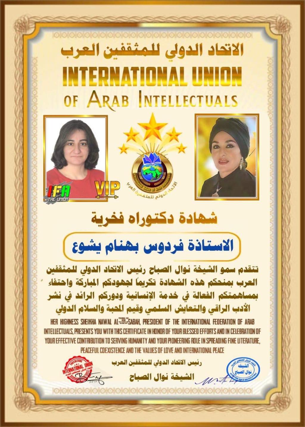 شهادة تقديرية من رئيسة الاتحاد الدولي للمثقفين لتدريسية في كلية الفنون الجميلة