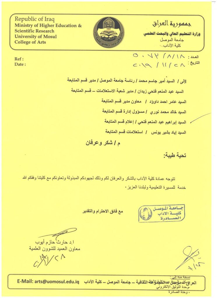 بتاريخ 17/12/2019 باشرت مسؤولة العلاقات والتواصل الجامعي باولى لقائتها مع الطلبة .ابتدات اولى جولاتها التعريفية للوحدة بكلية الاداب – قسم الفلسفة للتعريف بمهام الوحدة والية العمل مع الطلبة وبحضور السيد رئيس قسم الفلسفة والسيد مقرر القسم والسيد مسؤول شعبة الاستعلامات في قسم المتابعة