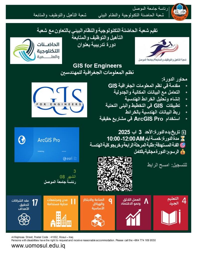 ويُعدّ هذا النشاط جزءاً من التوجه العام لجامعة الموصل نحو تسخير إمكانيات البيئة الجامعية في خدمة مؤسسات الدولة، من خلال نقل المعرفة التقنية وبناء القدرات، بما يخدم تحقيق أهداف التنمية المستدامة، ولا سيما:
