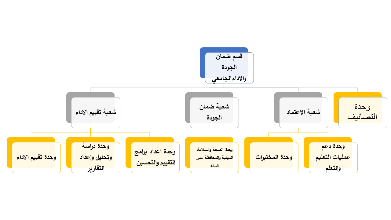 يرتبط قسم ضمان الجودة بمكتب السيد رئيس الجامعة وجهاز الاشراف والتقويم العلمي في وزارة التعليم العالي والبحث و يتكون القسم من اربع شعب رئيسية وهي: