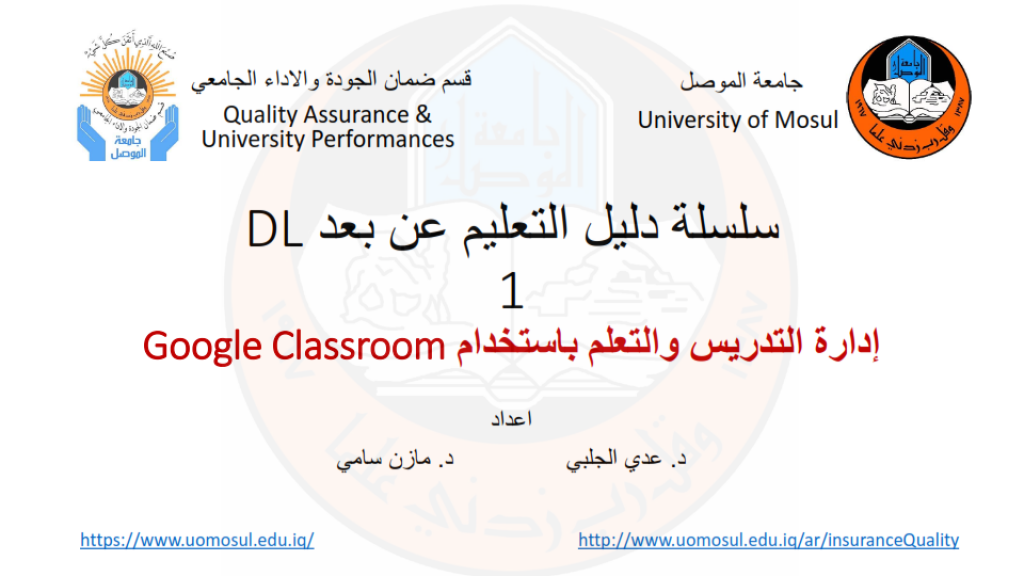 تنفيذا لتوجيهات الأستاذ الدكتور قصي كمال الدين الأحمدي المحترم رئيس جامعة الموصل حول ضرورة التواصل الإلكتروني في الظروف الراهنة التي تمر بها مدينة الموصل وجامعتنا المعطاء.فقد اصدر قسم ضمان الجودة والاداء الجامعي سلسلة من الارشادات الخاصة بالتعليم عن بعد وكيفية الاستفادة من الخدمات الالكترونية. اذ تم اعداد دليل للتدريسي عن امكانيات خدمة google classroom وهو اول دليل في السلسلة
