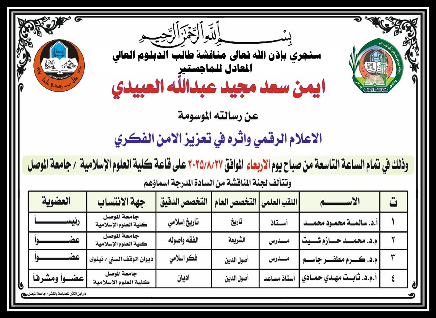 نوقشت هذا اليوم الأربعاء الموافق ٢٧ / ٨ / ٢٠٢٥ رسالة الدبلوم العالي المعادل للماجستير الموسومة ( الاعلام الرقمي وأثره في تعزيز الأمن الفكري ) [إقرأ المزيد]