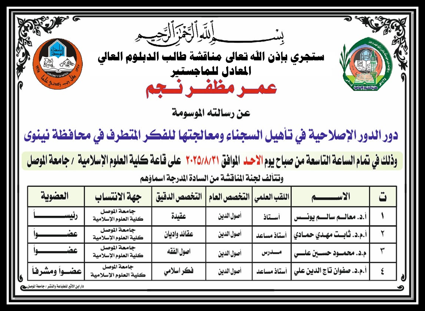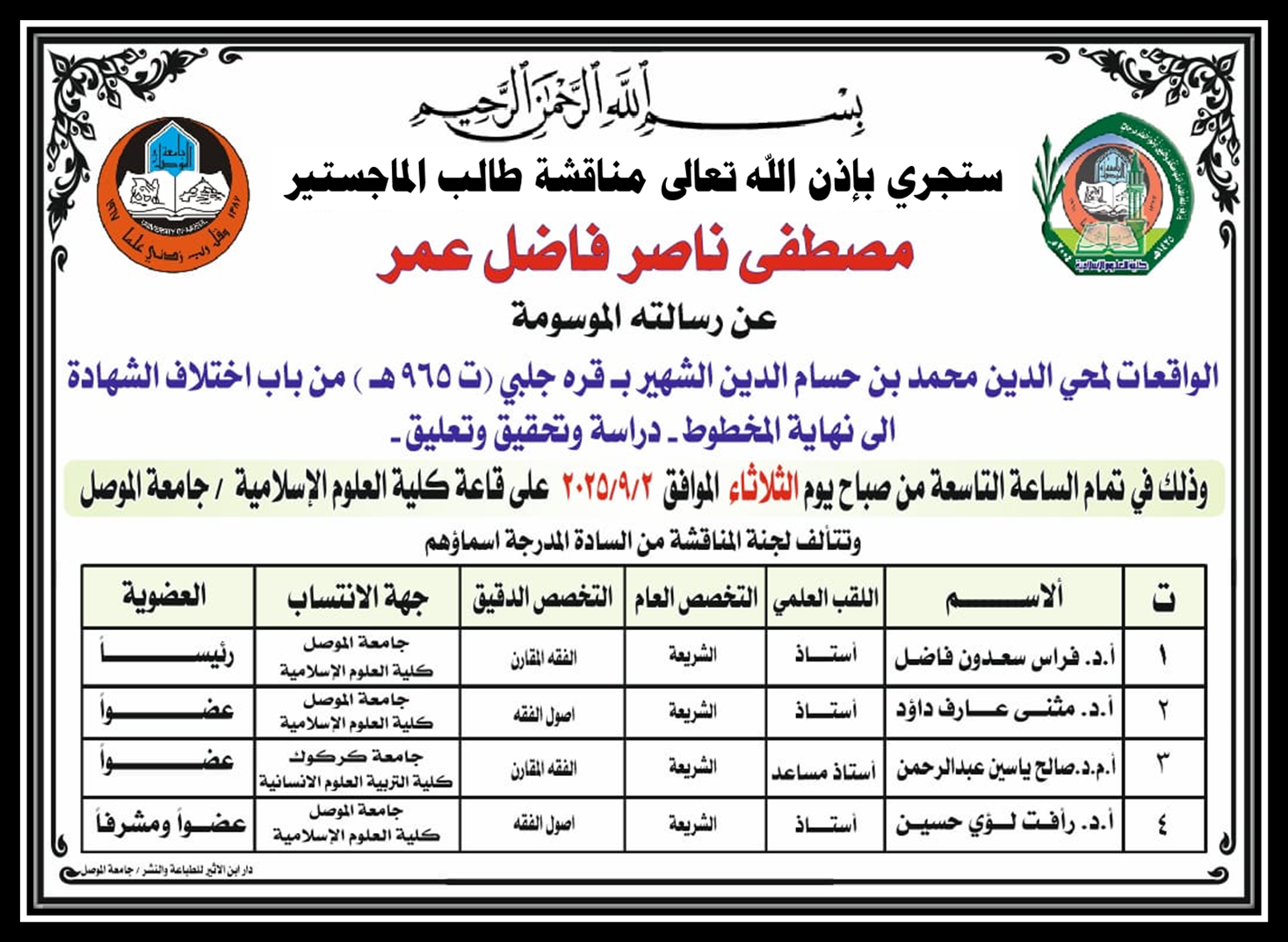 نوقشت صباح هذا اليوم الاربعاء الموافق 13/8/2025 في كلية العلوم الاسلامية بجامعة الموصل رسالة الماجستير الموسومة ( شرح تلخيص الاصول للشيخ احمد بن محمد التوقاتي [إقرأ المزيد]