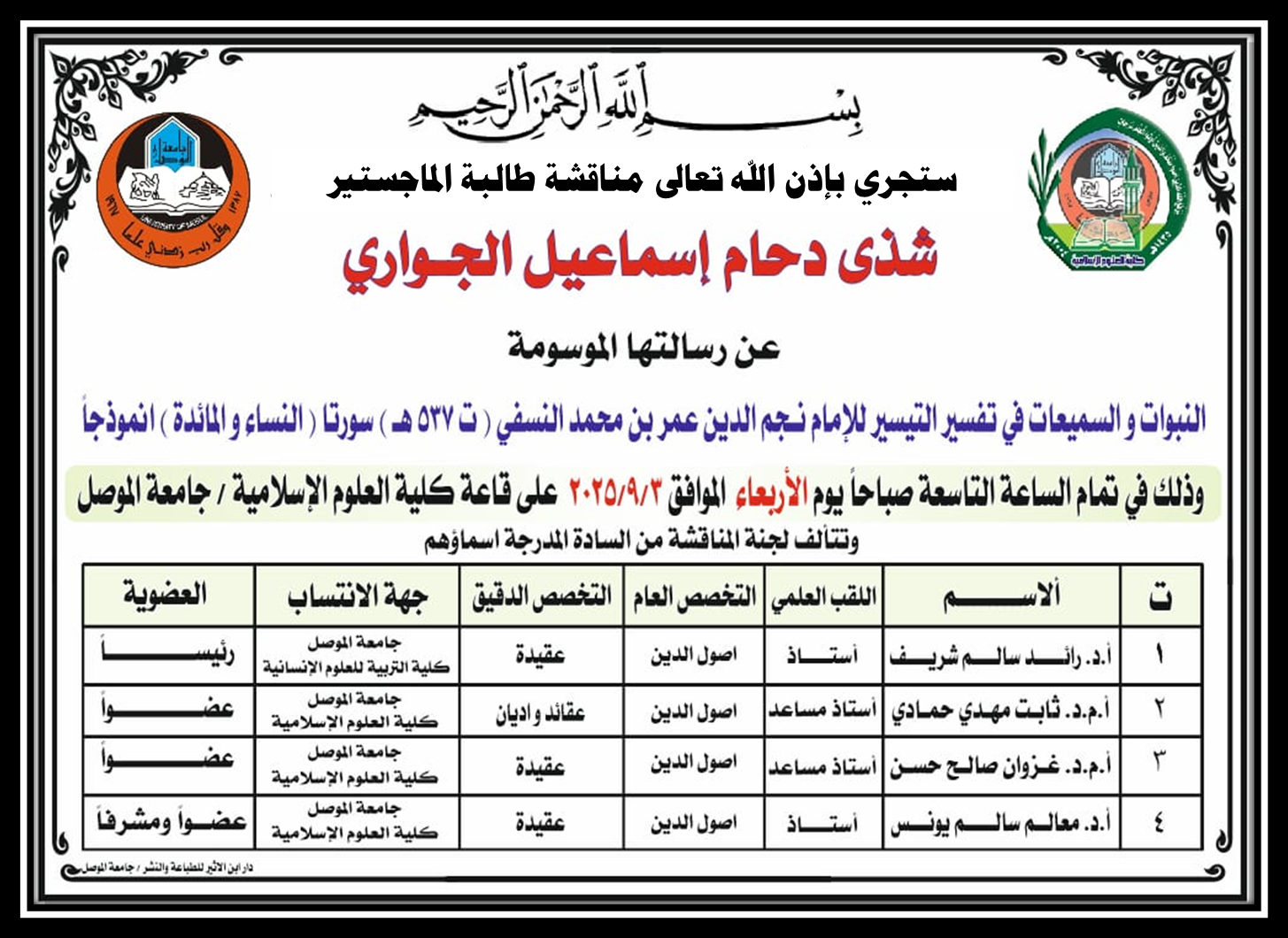 نوقشت هذا اليوم الأحد الموافق 24/ 8 /2025 في كلية العلوم الإسلامية بجامعة الموصل رسالة الماجستير الموسومة ( مناسبة قصّة سيدنا إبراهيم عليه السلام مع [إقرأ المزيد]