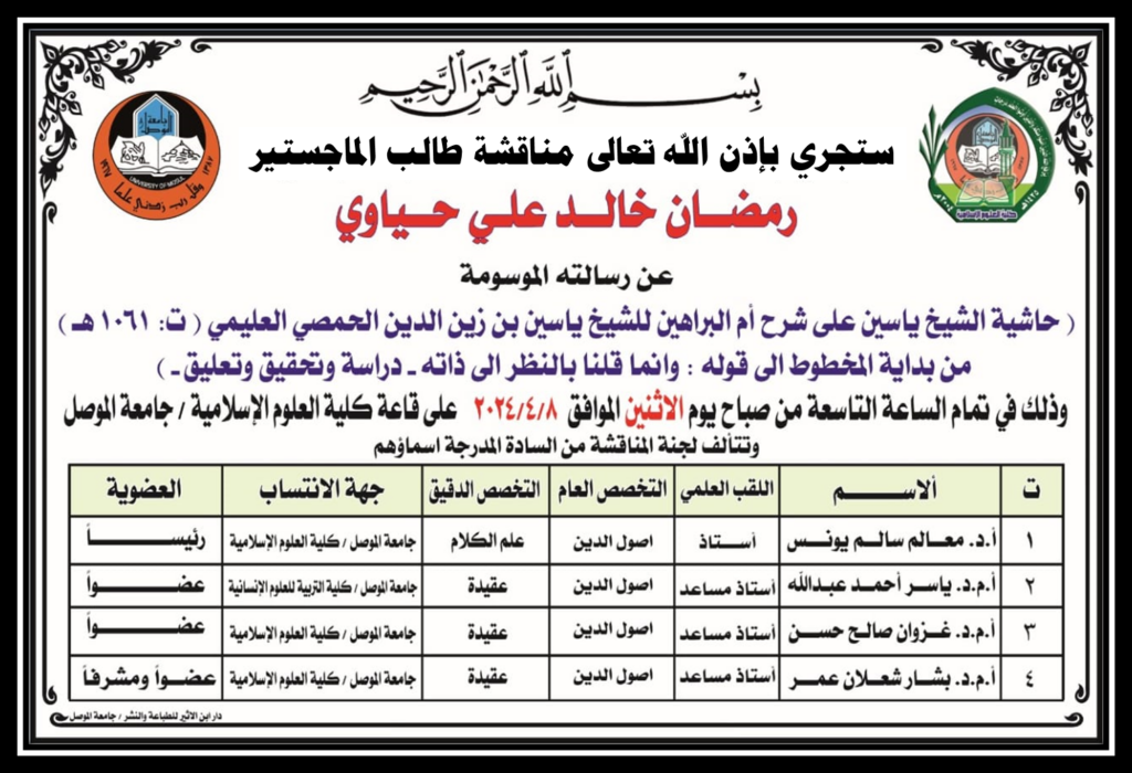 نوقشت هذا اليوم الإثنين الموافق 8 / 4 / 2024 في كلية العلوم الإسلامية بجامعة الموصل رسالة الماجستير الموسومة (حاشية الشيخ ياسين على شرح أم البراهين للشيخ ياسين بن زين الدين الحمصي العليمي (ت١٠٦١هـ) من بداية المخطوط إلى قوله : وإنما قلنا بالنظر إلى ذاته – دراسة وتحقيق وتعليق)، حضر جانباً منها السيد عميد الكلية الأستاذ الدكتور (طه حماد مخلف) والسيدان المعاونان العلمي والإداري والسيد رئيس قسم العقيدة والفكر الإسلامي .. وعدد من التدريسيين .