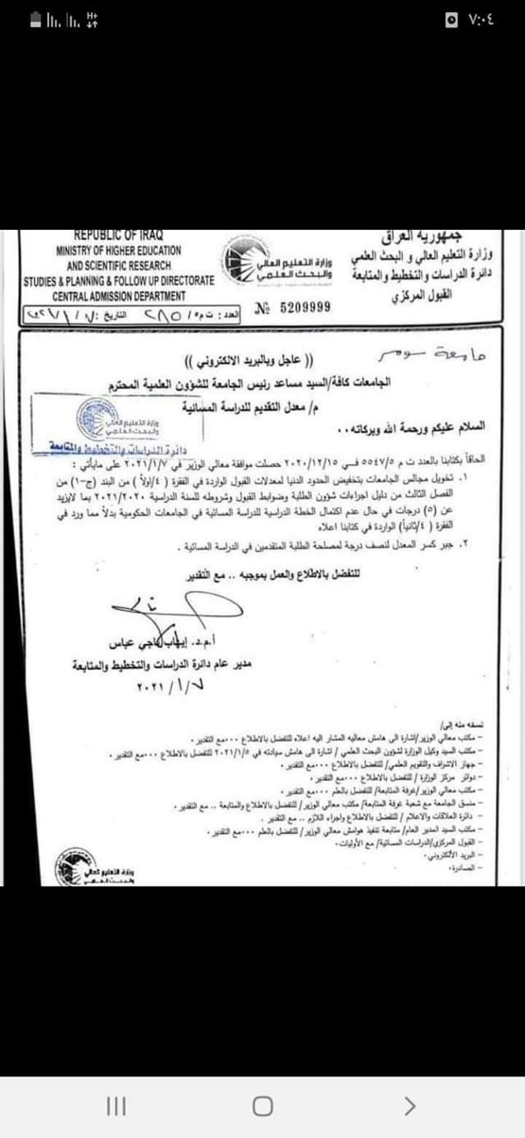 إلى طلبتنا الأعزاء خريجي الدراسة الإعدادية بفرعيها العلمي والأدبي وكذلك خريجي المدارس الإسلاميةاستناداً إلى كتاب وزارة التعليم العالي / دائرة الدراسات والتخطيط والمتابعة/ القبول المركزي بتاريخ ٧ / ١ / ٢٠٢١ والمتضمن تخفيض معدل القبول في الدراسة المسائية 5 درجات سيصبح معدل القبول في الدراسة المسائية 55% لهذا العام الدراسي الجديد ٢٠٢٠ – ٢٠٢١ .علما ان آخر موعد للتسجيل هو يوم الأربعاء ١٣ / ١ / ٢٠٢١