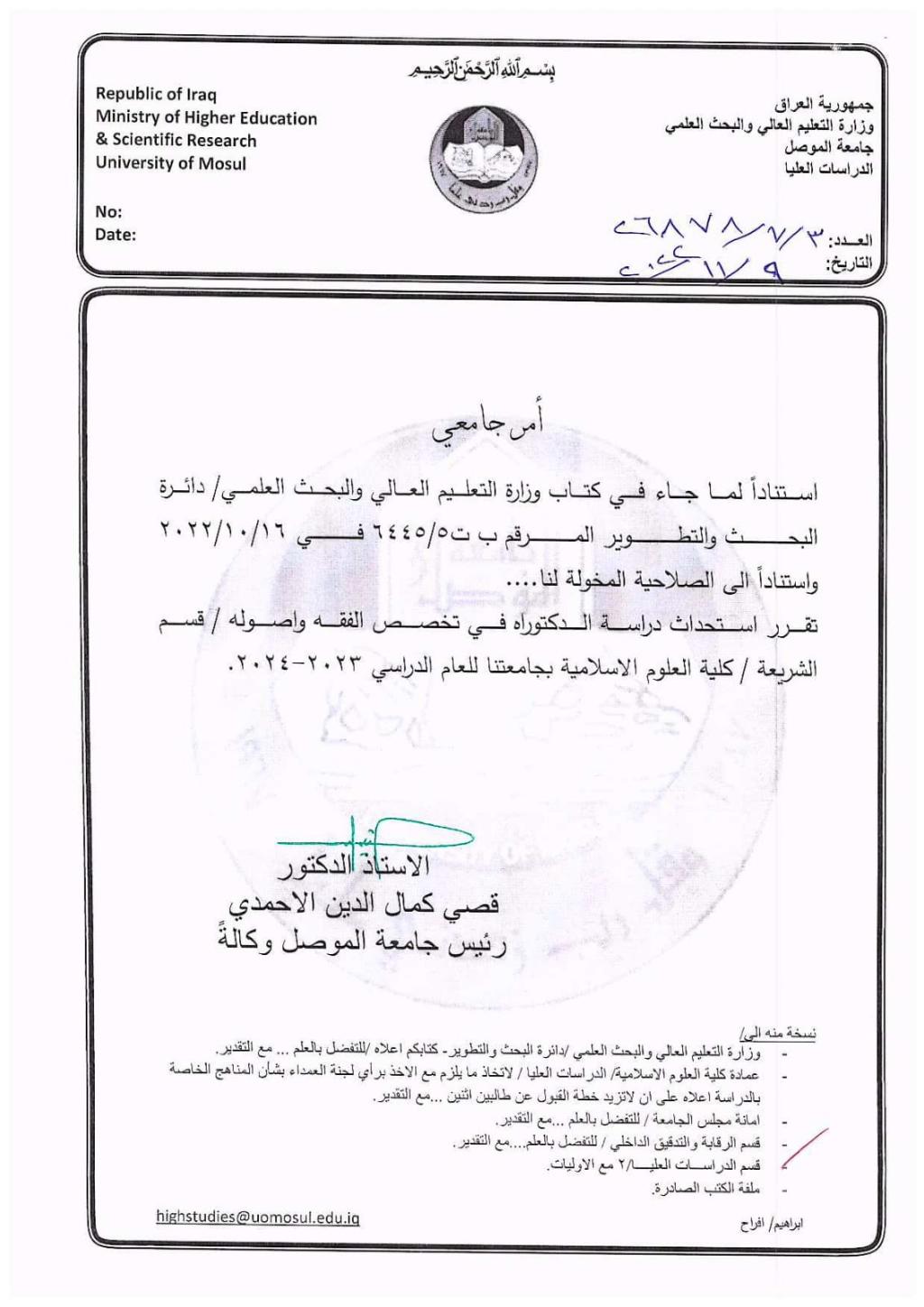 إنطلاقاً من سعي جامعتنا العريقة وعلى رأسها السيد رئيس الجامعة الأستاذ الدكتور قصي كمال الدين الأحمدي المحترم لدعم الحركة العلميةتزفّ كلية العلوم الإسلامية بشرى فتح دراسة الدكتوراه في قسم الشريعة.وبهذا المقام يتقدم السيد عميد الكلية الأستاذ الدكتور طه حماد مخلف بأسمى آيات العرفان للجهود الكريمة والمساعي المتواصلة التي سعت لهذه الإضافة المميزة في المسيرة العلمية والمعرفية.داعين الله تعالى التوفيق والسداد.