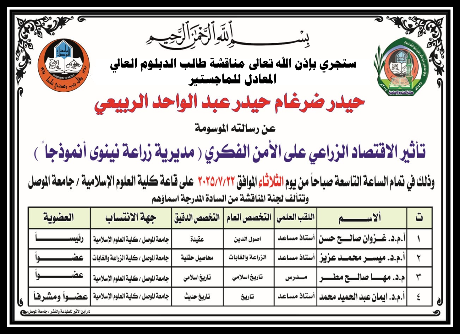 اعلان موعد مناقشة رسالة دبلوم عالي