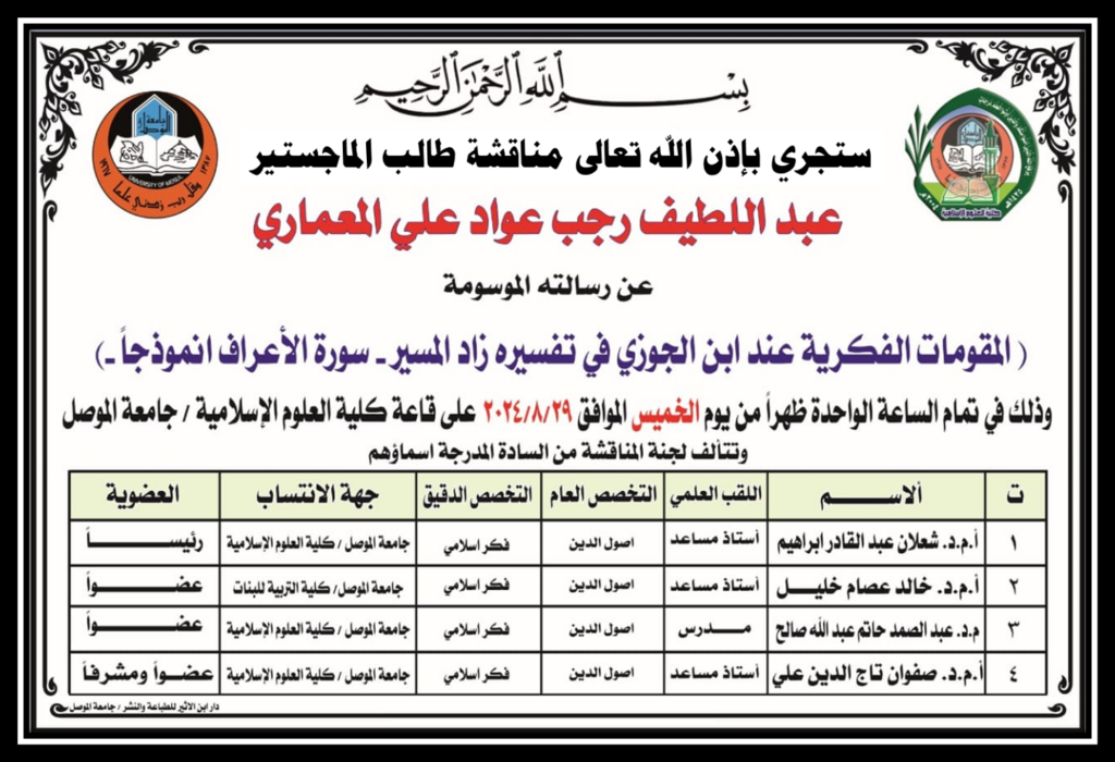 المقومات الفكرية عند أبن الجوزي في مناقشة رسالة ماجستير