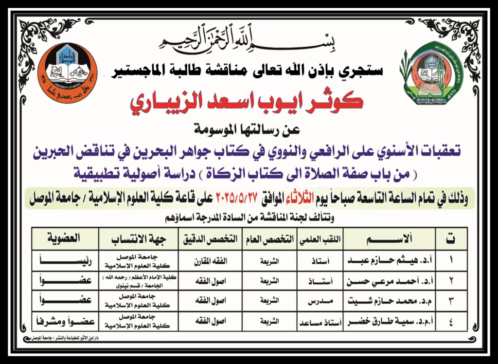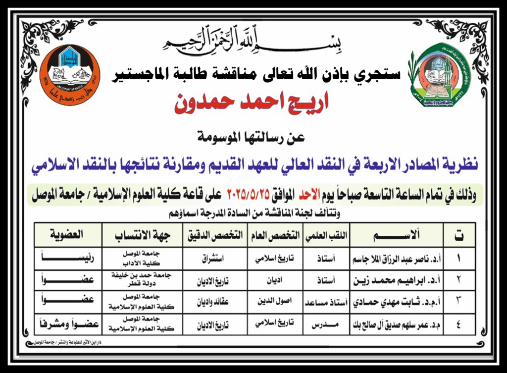 اعلان موعد مناقشة رسالة ماجستير