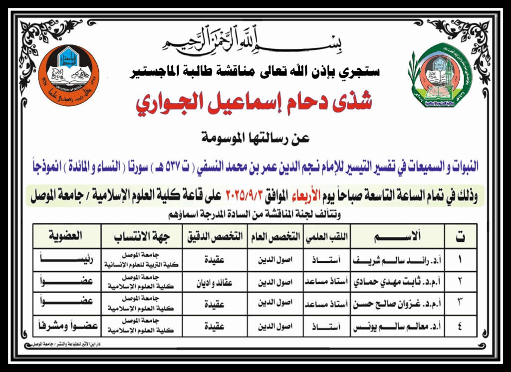 اعلان موعد مناقشة رسالة ماجستير
