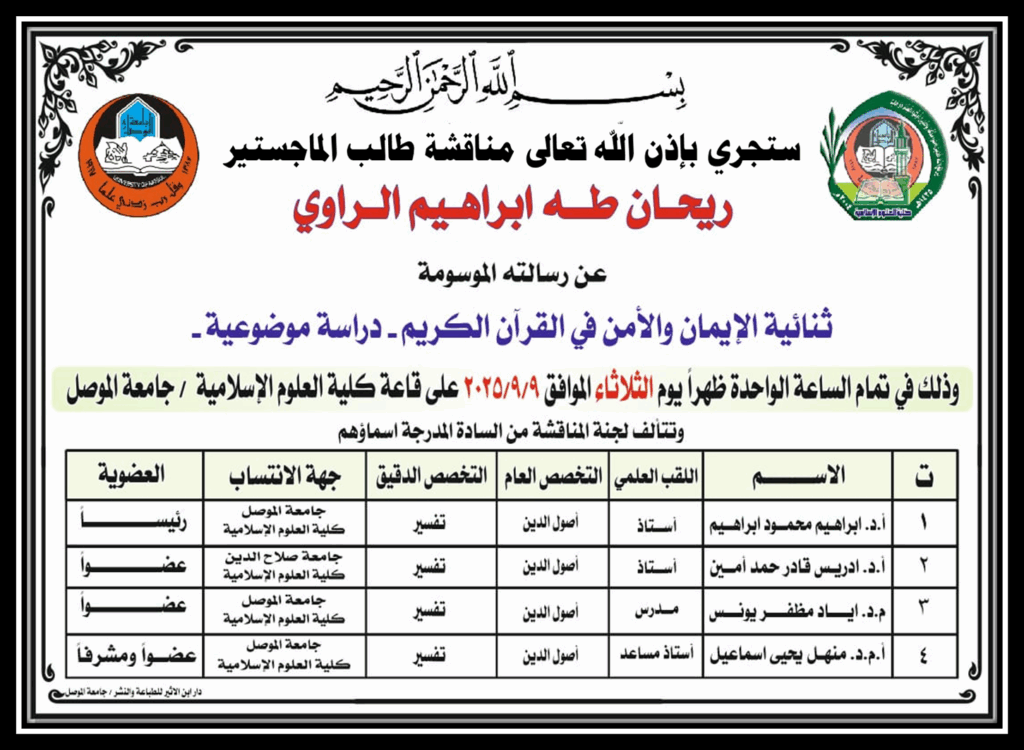 اعلان موعد مناقشة رسالة ماجستير