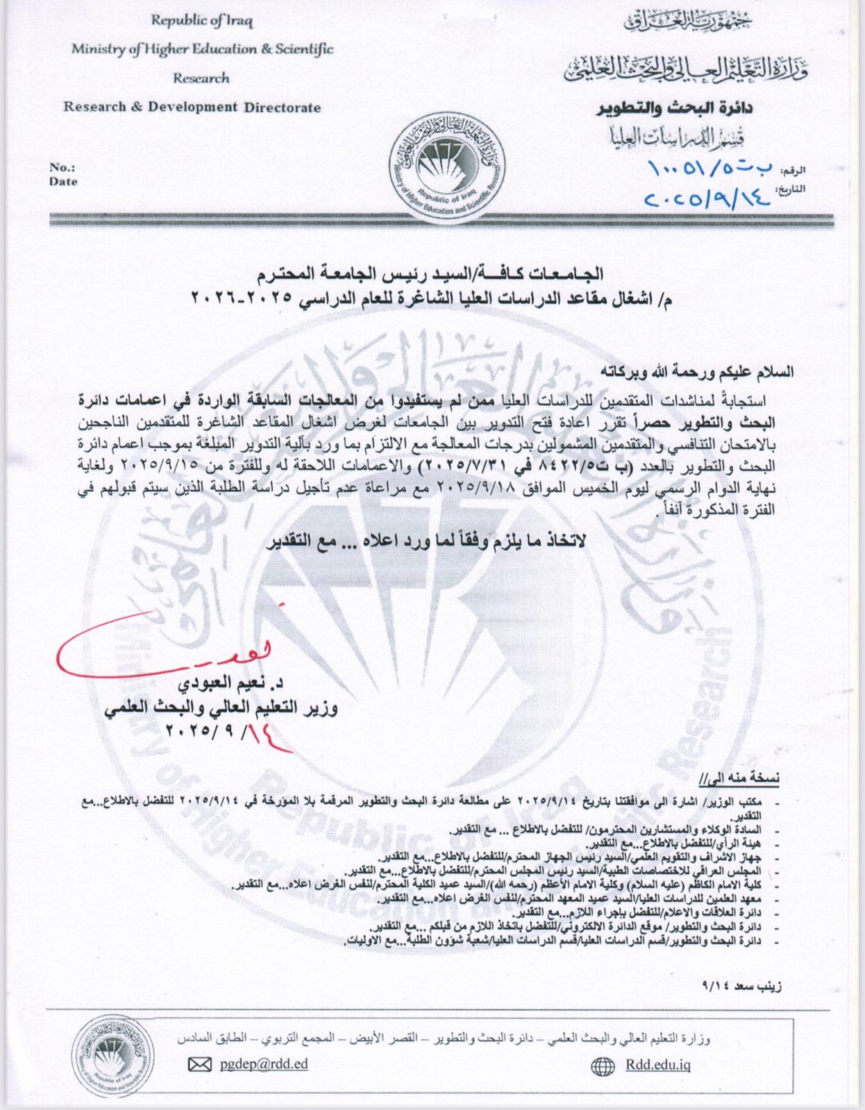 تعلن كلية العلوم الاسلامية عن فتح باب التدوير بين الجامعات للطلبة الناجحين ومعالجة الدرجات الحرجة ممن لم يستفيدوا منها سابقا ولغاية 18-9-2025 .