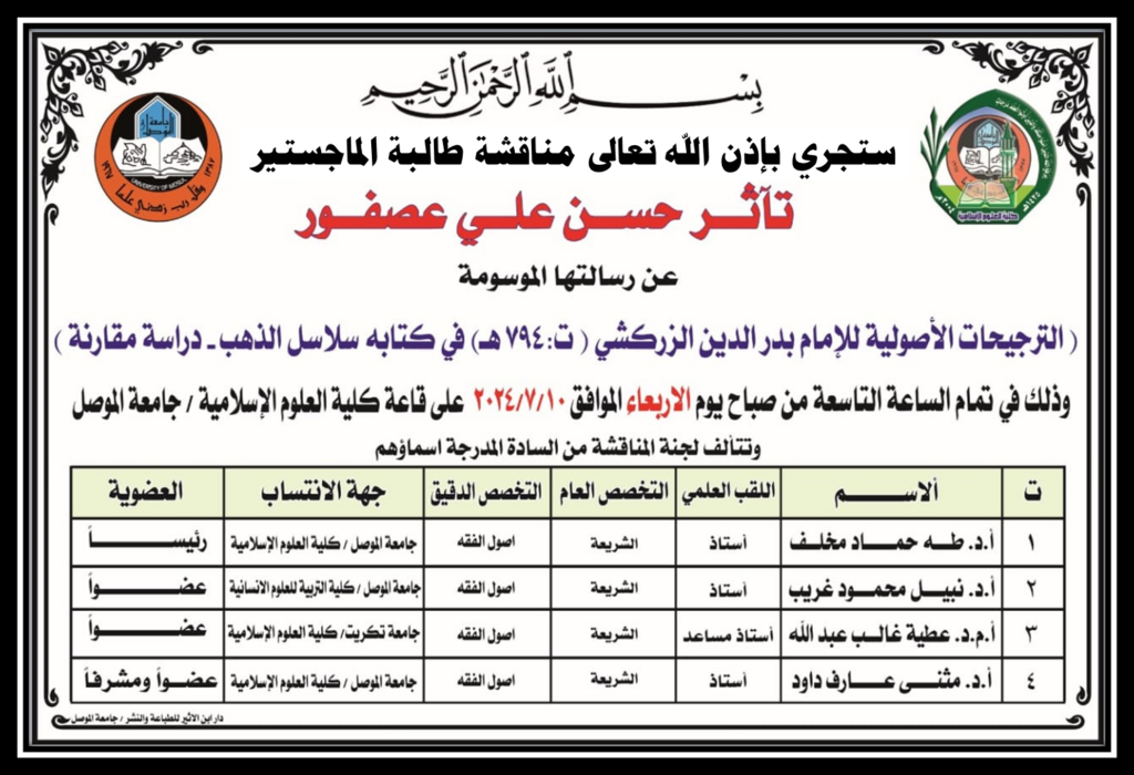 نوقشت هذا اليوم الاثنين الموافق 8/7/2024 في كلية العلوم الإسلامية بجامعة الموصل رسالة الماجستير الموسومة (التوفية في شرح معدل الصلاة للبركوي – للأمام إسماعيل الكوز حصاري الرومي ت:1131هـ من بداية المخطوط الى قوله “وإما السنة عطف على أما الكتاب” – دراسة وتحقيق) – حضر جانباً منها السيد عميد الكلية الأستاذ الدكتور طه حماد مخلف والسيد المعاون الإداري الأستاذ المساعد الدكتور ثابت مهدي حمادي والأستاذ المساعد الدكتورة ضحى سمير يونس مسؤولة شعبة الدراسات العليا وعدد من تدريسيي الكلية .