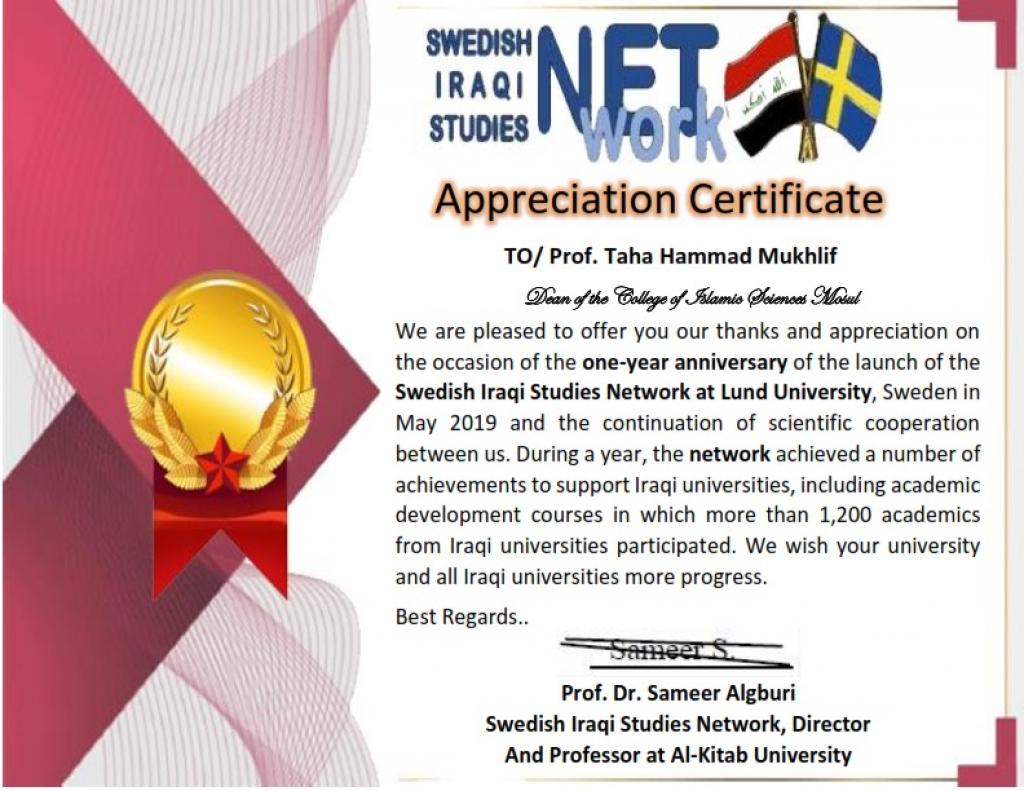 بمشاركة كريمة من الأمانة العامة لمجلس الوزراء ووزارة التعليم العالي والبحث العلمي وبحضور السيد رئيس الجامعة الأستاذ الدكتور قصي كمال الدين الاحمدي المحترم وعدد كبير من الشخصيات العلمية والأكاديمية احتفلت الشبكة السويدية العراقية للدراسات في 31 أيار 2020 الساعة 5 مساء بالذكرى الاولى لانطلاقتها في جامعة لوند السويدية .وقد تضمن منهاج الاحتفالية١. كلمة الامانة العامة لمجلس الوزراء٢. كلمة ا.د. سمير الجبوري مدير الشبكة السويدية العراقية للدراسات٣. تكريم المجلسين الاداري والاستشاري في الشبكة٤. تكريم رؤساء الجامعات التوأمة مع الشبكة.٥. تكريم رؤساء الفرق البحثية الثمانية في الشبكة٦. تكريم الخريجين الاوائل في دورات الشبكة.وقد كان لجامعة الموصل الحظ الأوفر من هذا التكريم حيث تم تكريم السيد عميد كلية العلوم الإسلامية باعتباره قائدا لفريق التراث والحضارة البحثي إحدى الفرق البحثية في الشبكة.وأيضا تم تكريم الدكتورة منال السماك والدكتور ميسر الجبوري من جامعة الموصل لقيادتهم بعض الفرق البحثية.مزيدا من التألق والإبداع لجامعتنا العزيزة في مسيرتها العلمية.