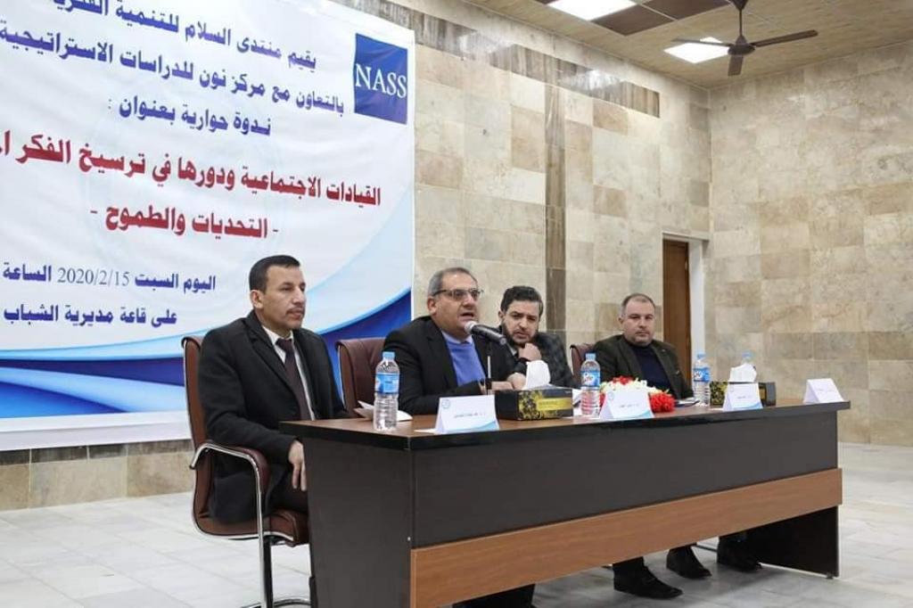 شاركت كلية العلوم الإسلامية هذا اليوم السبت الموافق ١٥ / ٢ / ٢٠٢٠ في الندوة الحوارية التي أقامها منتدى السلام للتنمية الفكرية بالتعاون مع مركز نون للدراسات الستراتيجية والموسومة ( القيادات الإجتماعية ودورها في ترسيخ الفكر المعتدل – التحديات والطموح )