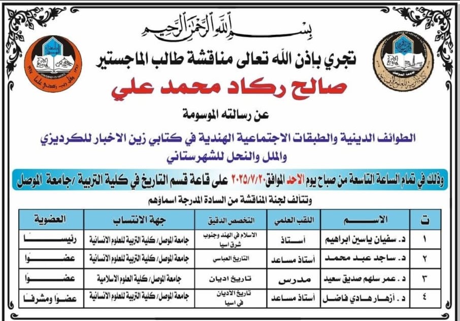 نوقشت صباح هذا اليوم الاربعاء الموافق 13/8/2025 في كلية العلوم الاسلامية بجامعة الموصل رسالة الماجستير الموسومة ( شرح تلخيص الاصول للشيخ احمد بن محمد التوقاتي [إقرأ المزيد]