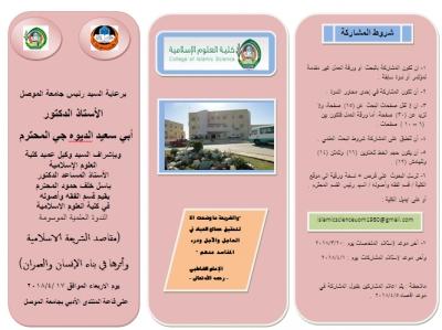 برعاية السيد رئيس جامعة الموصلالأستاذ الدكتورأبي سعيد الديوه جي المحترموبإشراف السيد وكيل عميد كلية العلوم الإسلاميةالأستاذ المساعد الدكتورباسل خلف حمود المحترميقيم قسم الفقه وأصولهفي كلية العلوم الاسلاميةلندوة العلمية الموسومة(مقاصد الشريعة الاسلاميةوأثرها في بناء الإنسان والعمران)يوم الاربعاء الموافق 17 /4/2018على قاعة المنتدى الأدبي بجامعة الموصل