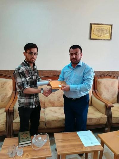 تثمينا للجهود المبذولة في المسابقة التي اقامتها كلية العلوم الاسلامية جامعة الموصل فقد تم توزيع كتب الشكر وهدايا تقديرية من عمادة الكلية للطلبة الفائزين الاوائل في مسابقات الحفظ للقران الكريم وحفظ الحديث والتلاوة والخطابة وتم تسليمها للطلبة من قبل الدكتور عبد الله سعود والدكتورة فاطمة محمد صالح .