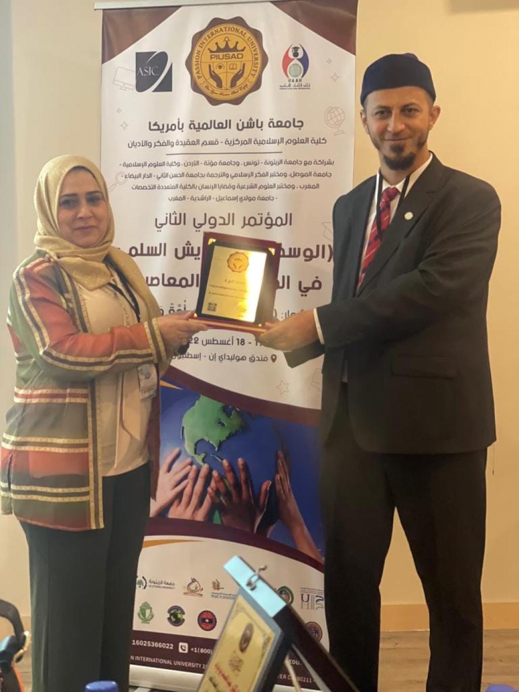 استلم السيد عميد الكلية الأستاذ الدكتور طه حماد مخلف هذا اليوم الأربعاء الموافق ٣١ / ٨/ ٢٠٢٢ درع التكريم المقدم من السيد رئيس جامعة باشن الأمريكية الدكتور إسماعيل الشرقاوي تثمينا لجهود عمادة الكلية وباحثيها في المؤتمر الدولي الثاني الذي نظمه قسم العقيدة والفكر والأديان تحت عنوان “الوسطية والتعايش السلمي في المجتمعات المعاصرة” بشعار ((وكذلك جعلناكم أمة وسطا)) ، في مدينة إسطنبول بتاريخ 17 ، 18 أغسطس / آب 2022 .هذا وقد قام بايصال الدرع والشهادات التقديرية الدكتورة عبير مفكر ال الشيخ والتي شاركت حضوريا في وقائع المؤتمر ونقلت تحايا رئيس جامعة باشن المفتوحة إلى السيد رئيس جامعة الموصل الاستاذ الدكتور قصي كمال الدين الاحمدي والى عميد كلية العلوم الإسلامية وكافة منتسبيها.بدوره قدم السيد عميد الكلية الشكر للدكتورة عبير مفكر على جهودها المبذولة في دعم الكلية ونشاطاتها العلمية.