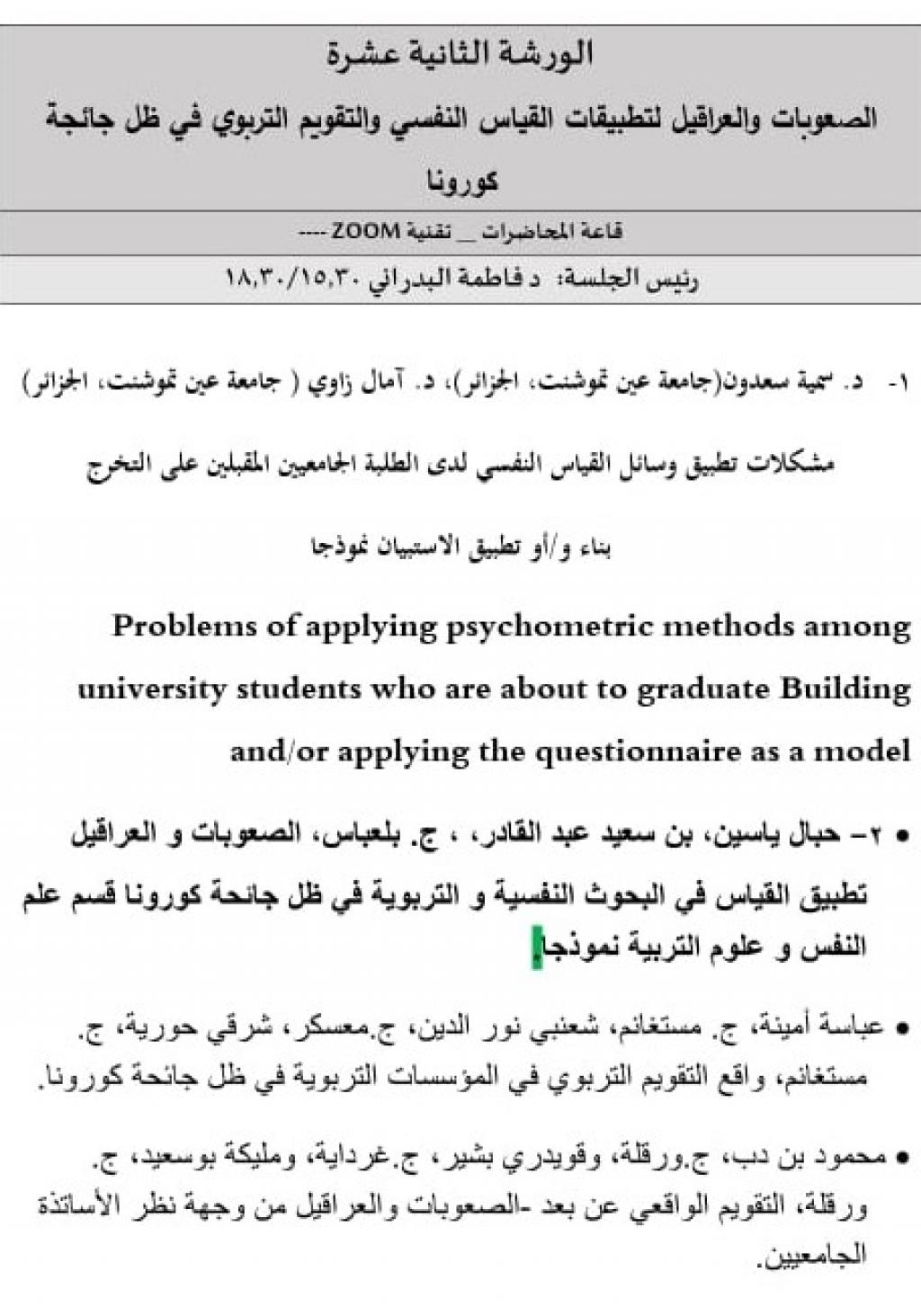 شاركت التدريسية في كليتنا أ.م.د. فاطمة محمد صالح بتاريخ 12 أيلول 2021 برئاسة إحدى الجلسات العلمية في المؤتمر الدولي بالجزائر في جامعة مصطفى اسطنبولي / كلية العلوم الإنسانية والاجتماعية بالتعاون مع جامعة وهران.. وكان المؤتمر حول :( الاتجاهات الحديثة في القياس النفسي والتقويم التربوي واستخداماتها في ظل جائحة كورونا )