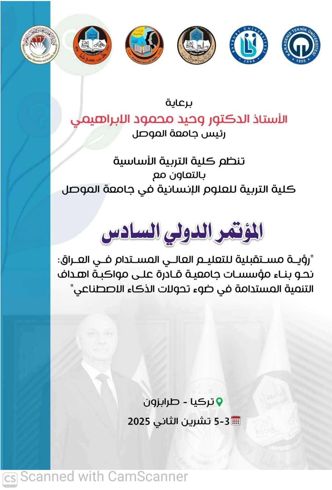 نظّمت جامعة الموصل بالشراكة مع جامعة مارتن لوثر الألمانية المؤتمر الدولي السادس لكلية التربية الأساسية تحت شعار ” رؤية مستقبلية للتعليم العالي المستدام في العراق نحو بناء مؤسسات جامعية قادرة على مواكبة اهداف التنمية المستدامة في ضوء تحولات الذكاء الاصطناعي“.