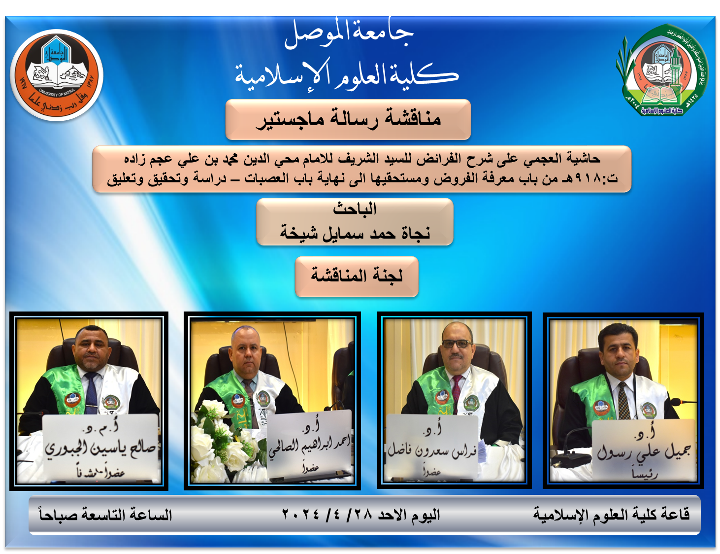 نوقشت هذا اليوم الاحد الموافق 28 / 4 / 2024 في كلية العلوم الإسلامية بجامعة الموصل رسالة الماجستير الموسومة (حاشية العجمي على شرح الفرائض للسيد الشريف للأمام محي الدين محمد بن علي عجم زاده ت:918هـ من باب معرفة الفروض ومستحقيها الى نهاية باب العصبات – دراسة وتحقيق وتعليق -)، حضر جانباً منها السيد عميد الكلية الأستاذ الدكتور (طه حماد مخلف) والسيدان المعاونان العلمي والإداري .. وعدد من التدريسيين .