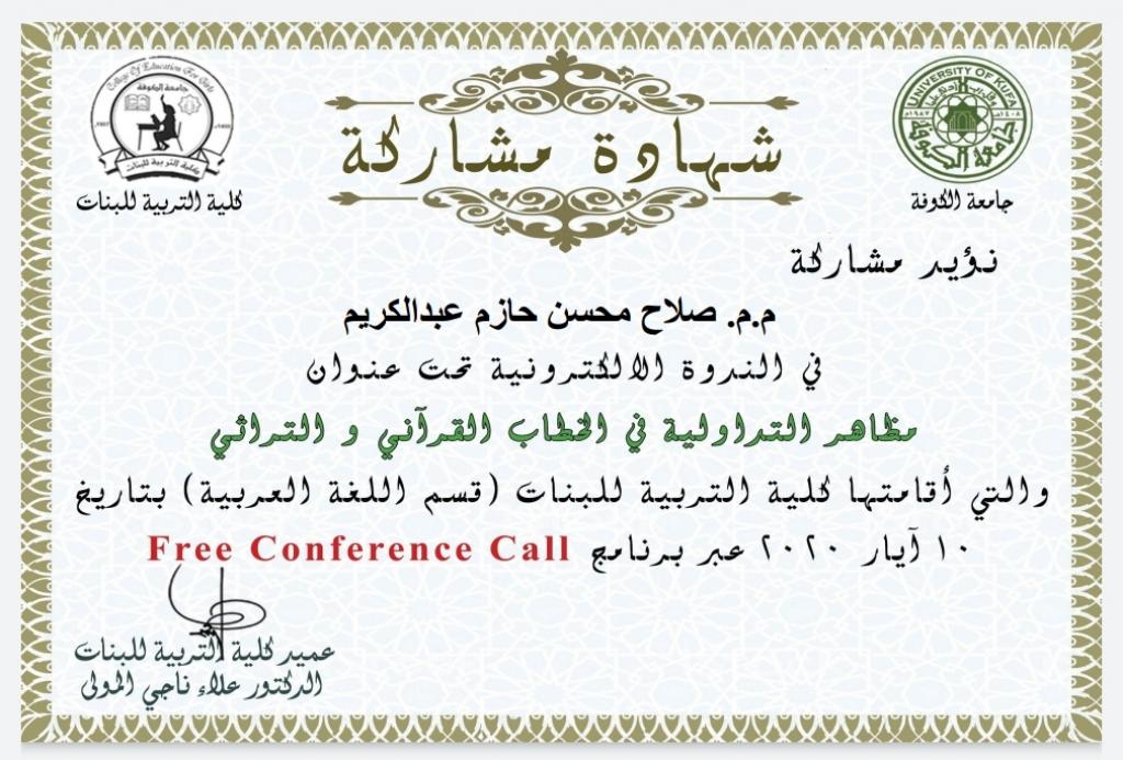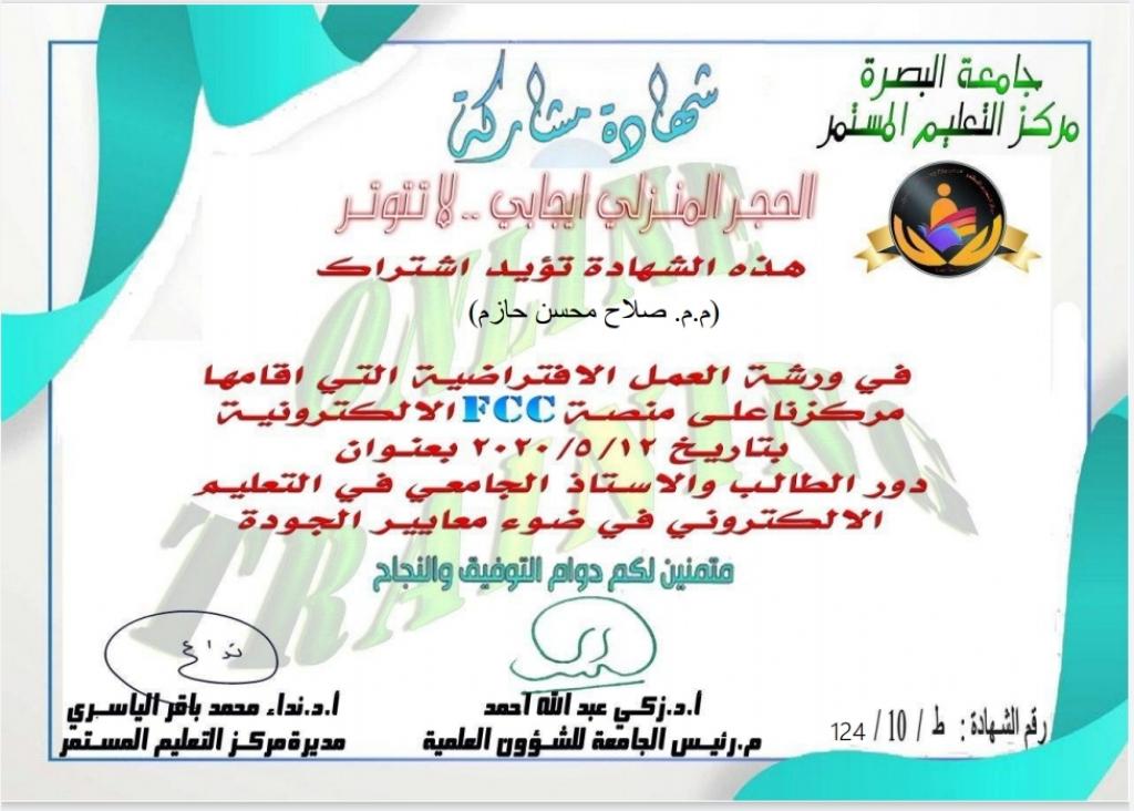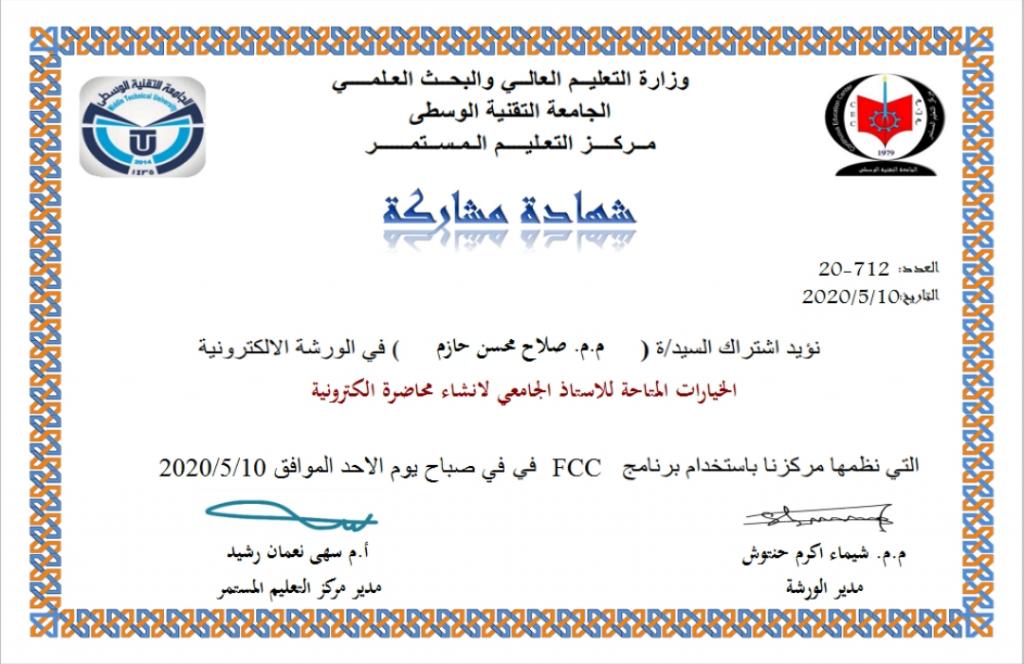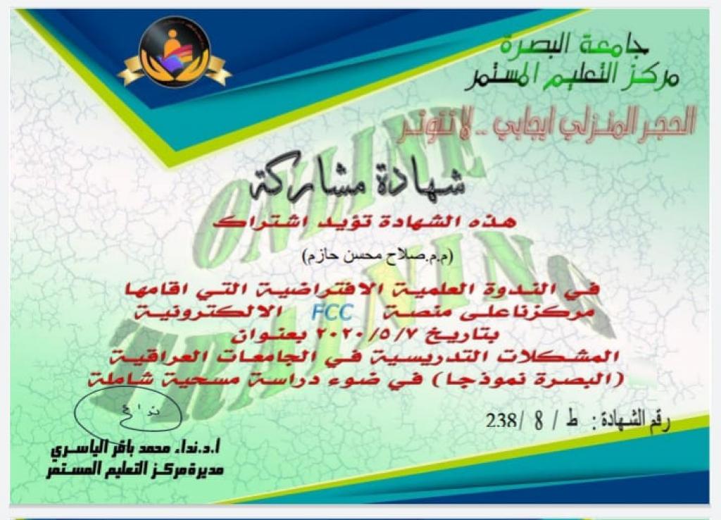 شارك المدرس المساعد صلاح محسن حازم عبد الكريم أحد تدريسي قسم الشريعة في كلية العلوم الإسلامية في عدد من الدورات التدريبية من خلال منصات التواصل الاجتماعي