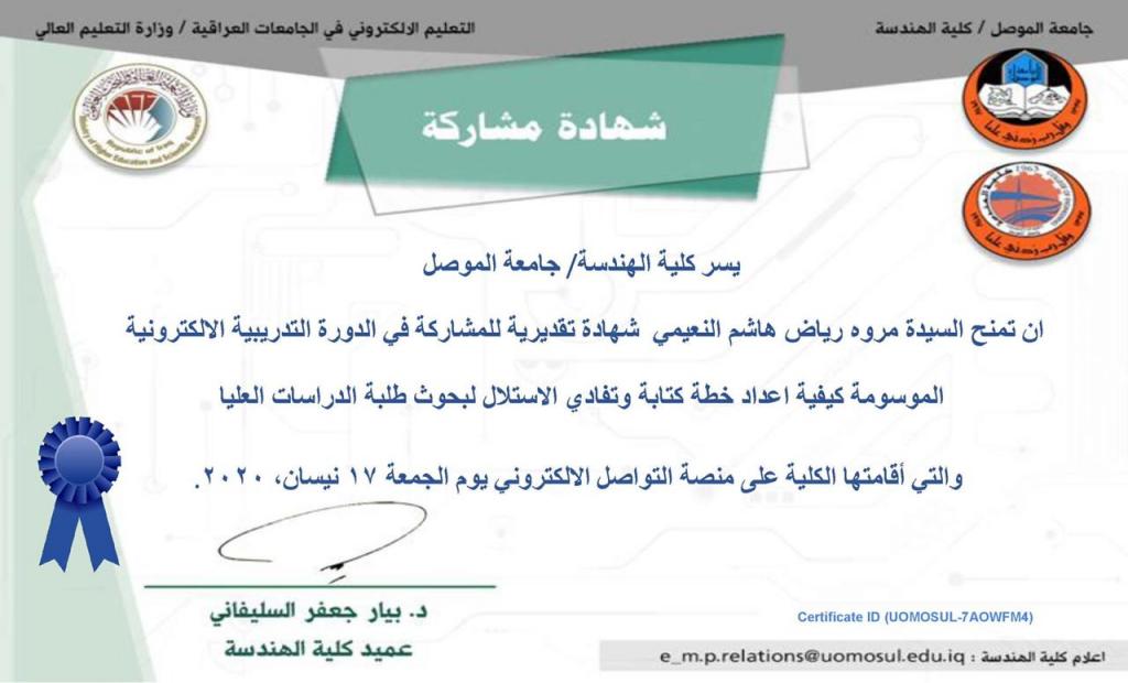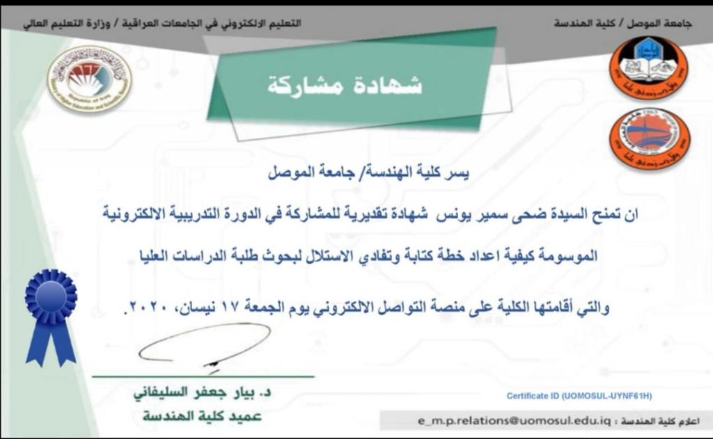 دورات تدريبيةحصلت كل من التدريسيتين :م.م. ضحى سمير يونسم.م. مروة رياض هاشمعلى شهادة تقدير لمشاركتهما وعلى منصة التواصل الاجتماعي في الدورة التدريبية الالكترونية التي أقامتها كلية الهندسة في جامعة الموصل والموسومة (كيفية اعداد خطة كتابة وتفادي الاستلال لبحوث طلبة الدراسات العليا) يوم الجمعة الموافق 17/4/2020وتأتي هذه المشاركات تأكيدا لتوجيهات الوزارة في تعزيز التعليم الإلكتروني .
