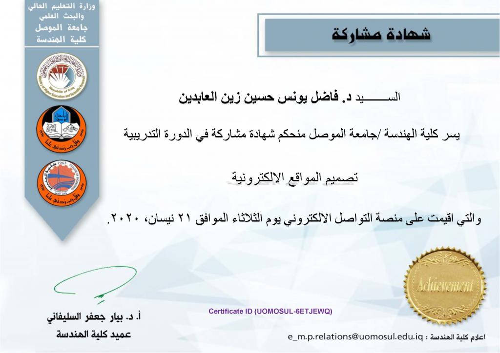 دورات تدريبيةحصل د. فاضل يونس حسين مقرر الدراسة المسائية في قسم العقيدة والفكر الإسلامي ومسؤول وحدة المختبرات على العديد من شهادات المشاركة في الدورات التدريبية وورش العمل الإلكترونية.. وكان آخرها شهادتين واحدة من جامعة ليفربول وأخرى من جامعة هارفارد يوم الثلاثاء الموافق 21/4/2020
