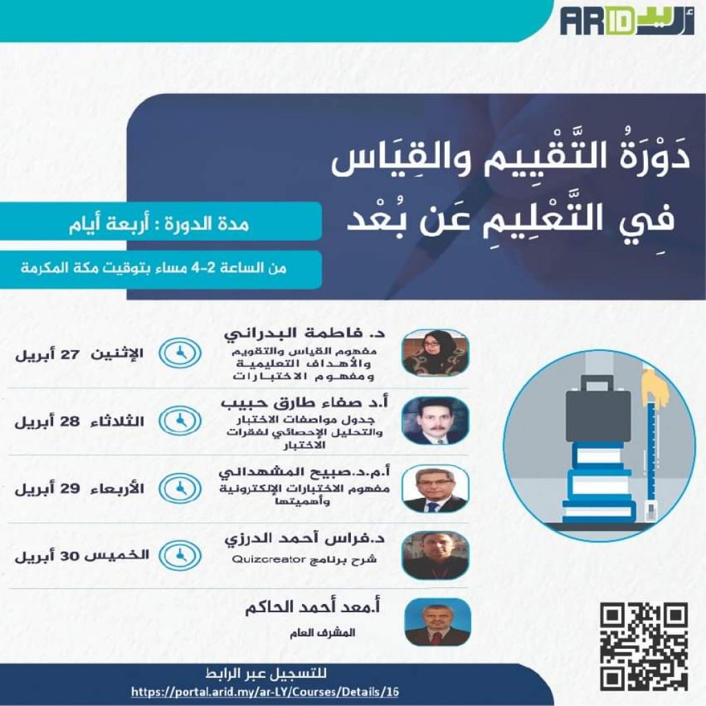 دورة التقويم والقياس في التعليم عن بعد27-30 أبريل 2020 – نظام تعليمتعلن منصة أريد عن تنظميها لدورة تدريبية في نظام عليم بعنوان “دورة التقويم والقياس في التعليم عن بعد” لمدة أربعة أيام ابتداء من يوم الاثنين 27 أبريل ولغاية يوم الخميس 30 أبريل من الساعة 2-4 مساء بتوقيت مكة.تفاصيل الدورة- فهم التقويم والقياس.- شرح الأهداف التعليمية.- بيان مفهوم الاختبارات.- شرح جدول المواصفات.- شرح التحليل الإحصائي لفقرات الاختبار.- توضيح مفهوم الاختبارات الإلكترونية، وأهميتها.- شرح برنامج Quizcreatorمحاور الدورة :اليوم الأول: ا.م. د. فاطمة محمد صالح البدرانيمفهوم القياس والتقويم، والأهداف التعليمية، ومفهوم الاختبارات.اليوم الثاني: أ د صفاء طارق حبيبجدول مواصفات الاختبار، والتحليل الإحصائي لفقرات الاختباراليوم الثالث: أ م د صبيح عباس المشهدانيمفهوم الاختبارات الإلكترونية، وأهميتهااليوم الرابع: د.فراس أحمد الدرزيشرح برنامج Quizcreatorمخرجات الدورة :التعرف على مفهوم القياس والتقويم، والأهداف التعليمية، ومفهوم الاختبارات. جدول مواصفات الاختبار، والتحليل الإحصائي لفقرات الاختبار. مفهوم الاختبارات الإلكترونية، وأهميتها. شرح برنامج Quizcreatorالمشرف العام / أ. معد أحمد الحاكمللتسجيل في الدورة مجانا عبر الرابطhttps://portal.arid.my/ar-LY/Courses/Details/16