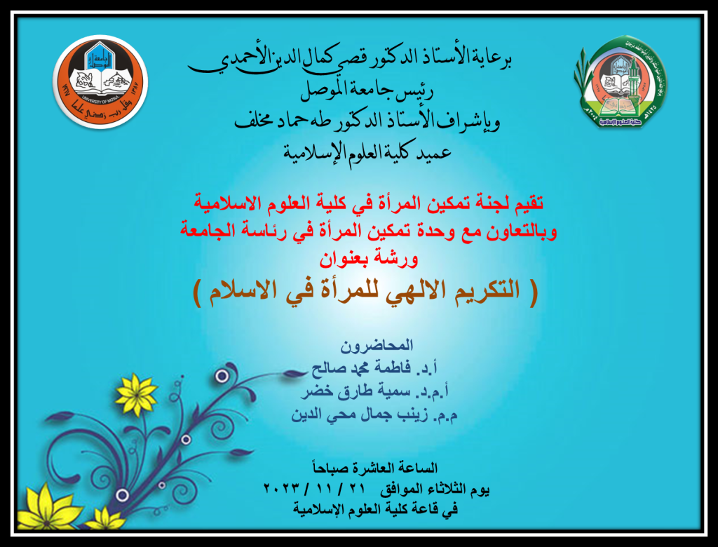 تم بعون الله اليوم الخميس الموافق 16/11/2023 اكمال محاضرات الدورة التي أقامها قسم الحديث وعلومه بعنوان (احكام التجويد ومصطلحاته) حضر جانباً منها السيد عميد الكلية الأستاذ الدكتور طه حماد مخلف والسيد المعاون الإداري الأستاذ المساعد الدكتور ثابت مهدي حمادي والسادة رؤساء الأقسام العلمية .