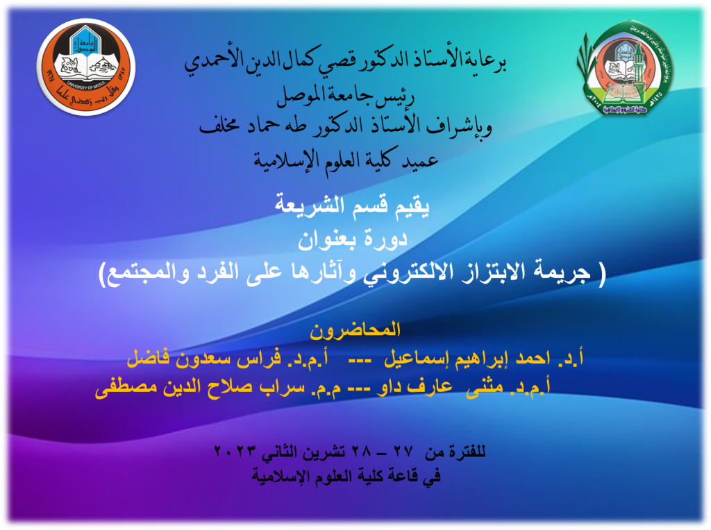 بإشراف السيد عميد كلية العلوم الإسلامية الأستاذ الدكتور طه حماد مخلف ومتابعة من قبل السيد معاون العميد للشؤون العلمية والدراسات العليا أقام (قسم العقيدة والفكر الإسلامي) وبالتعاون مع (وحدة التعليم المستمر) دورة بعنوان (الحوار والتعايش الفكري بين العقائد الدينية في المجتمع المدني -وثيقة المدينة أنموذجاً) وقد حاضر فيها كل من: