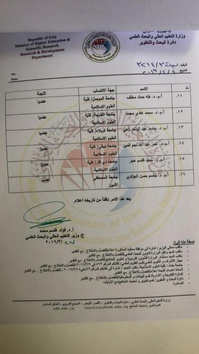 وزارة التعليم العالي والبحث العلمي تختار الاستاذ الدكتور طه حماد مخلف عميد كلية العلوم الاسلامية لعضوية لجنة تحديث وتطوير مناهج العلوم الاسلامية في الجامعات العراقية , وذلك بأمرها الوزاري ذي العدد( ب ت 3 3214) بتاريخ 4/4/2016.