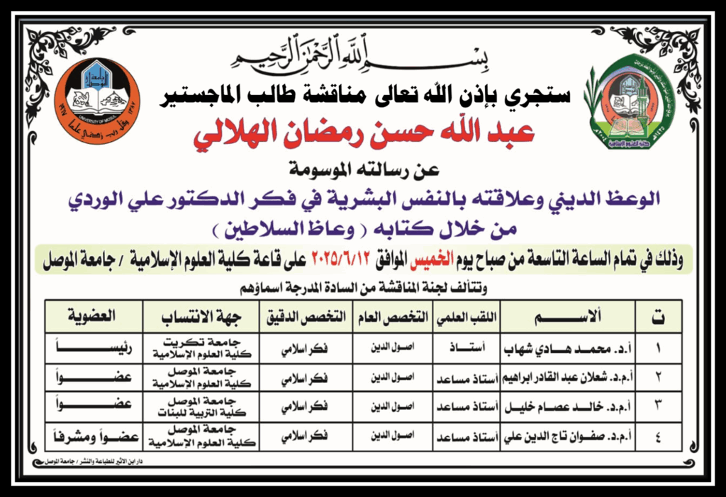 عقد مجلس كلية العلوم الإسلامية جلسته السادسة عشرة الصباحية اليوم الاثنين 2-6-2025 للعام الدراسي 2024-2025.