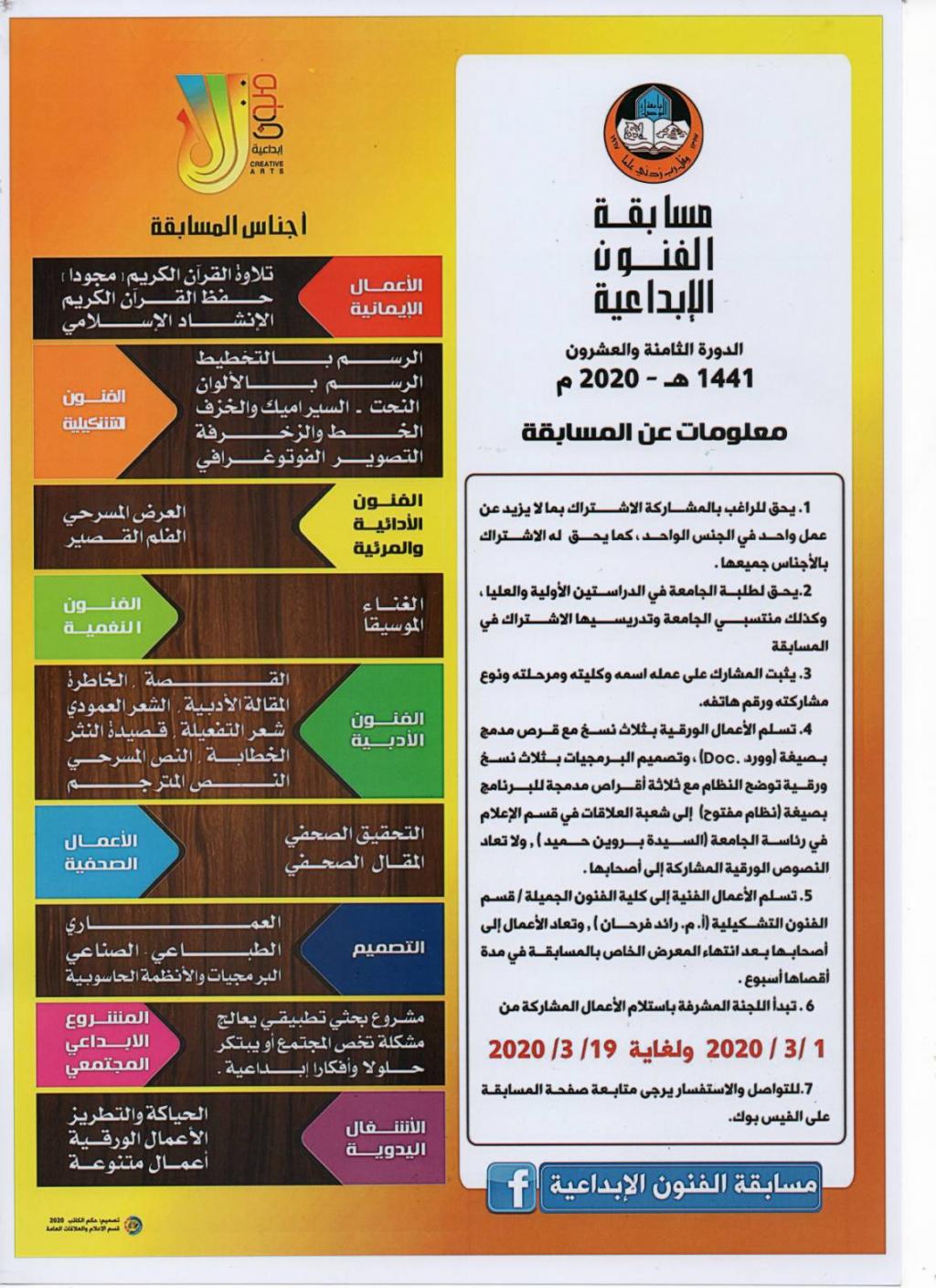على الراغبين بالمشاركة في مسابقة الفنون الابداعية الدورة الثامنة والعشرون 1441هـ – 2020 م . مراجعة السيد نشوان احمد حسن مدير شعبة إعلام الكلية لتسجيل اسمائهم . ولمزيد من المعلومات عن المسابقة يرجى قراءة المنشور الخاص بالمسابقة .